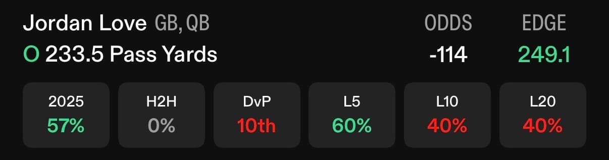 Coming off a 360-yard game and averaging 246.3 yards per game this season at home are likely two reasons that Edge likes this prop tonight. Love is averaging 256.9 yards per game this season overall, clearing this line in 57% of his starts.