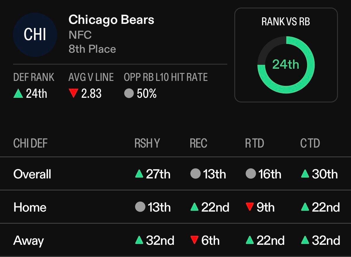 In his last 2 games, Brown has come alive. He has 181 rushing yards on 23 carries (7.86 YPC) and 24 receiving yards. Although he’s been under this number in every single game this season except his last 2. Edge is clearly leaning heavily on his last two, and his matchup against the Bears, who rank 27th in rush yards allowed, 32nd in rush yards allowed at home, and 24th in R&R yards allowed to opposing running backs.