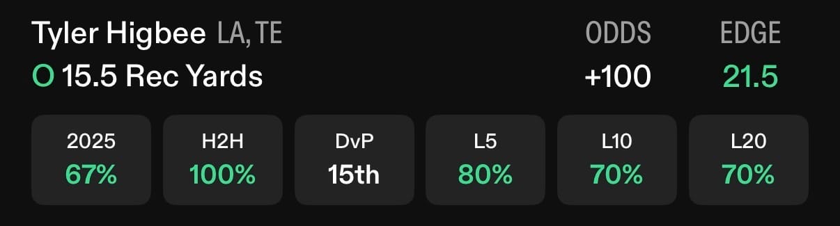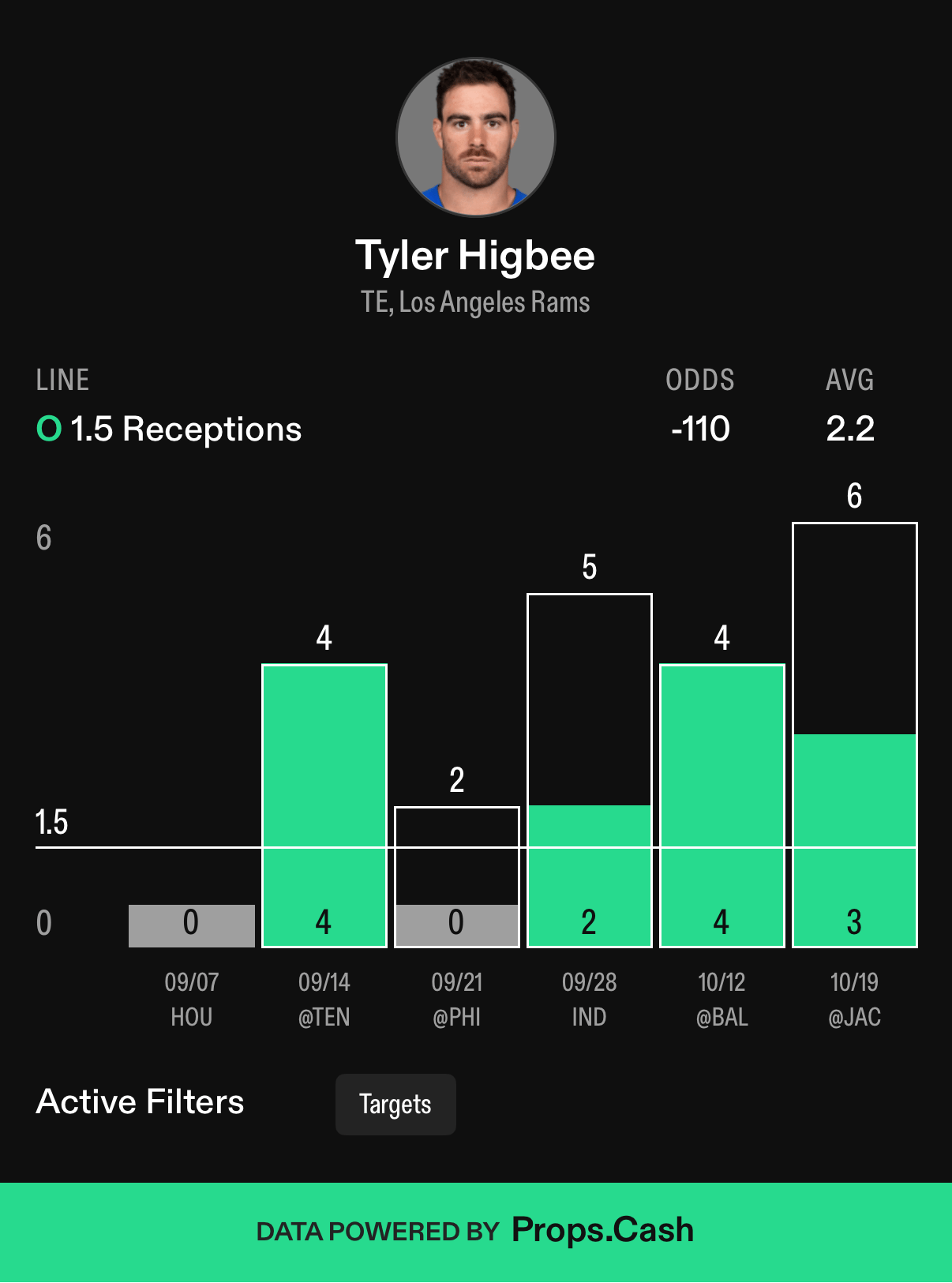 Tyler Higbee receiving yard prop is the top trend by Edge on the Props.Cash app for this game.