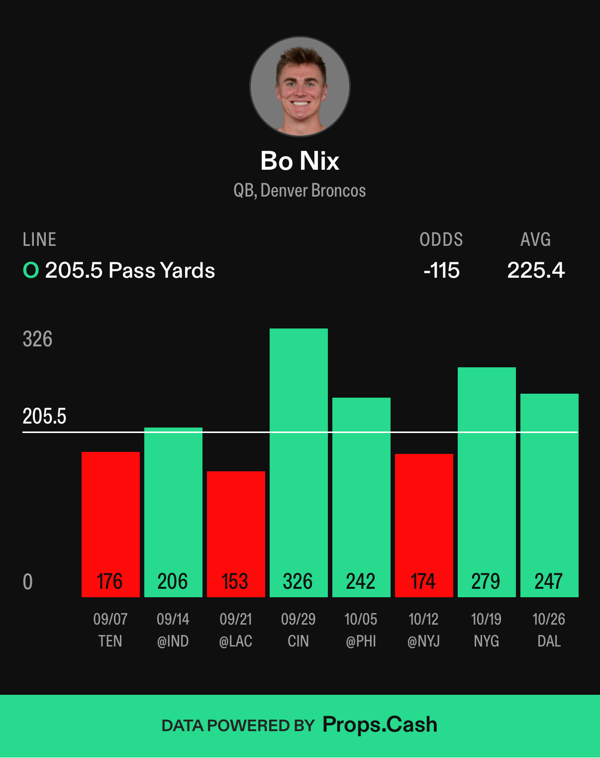 Bo’s Nix passing yards prop is the top trend by Edge on the Props.Cash app for this game.