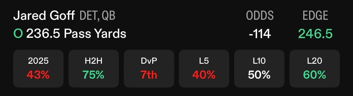 Jared Goff’s passing yards prop is the top trend by Edge on the Props.Cash app for this game.