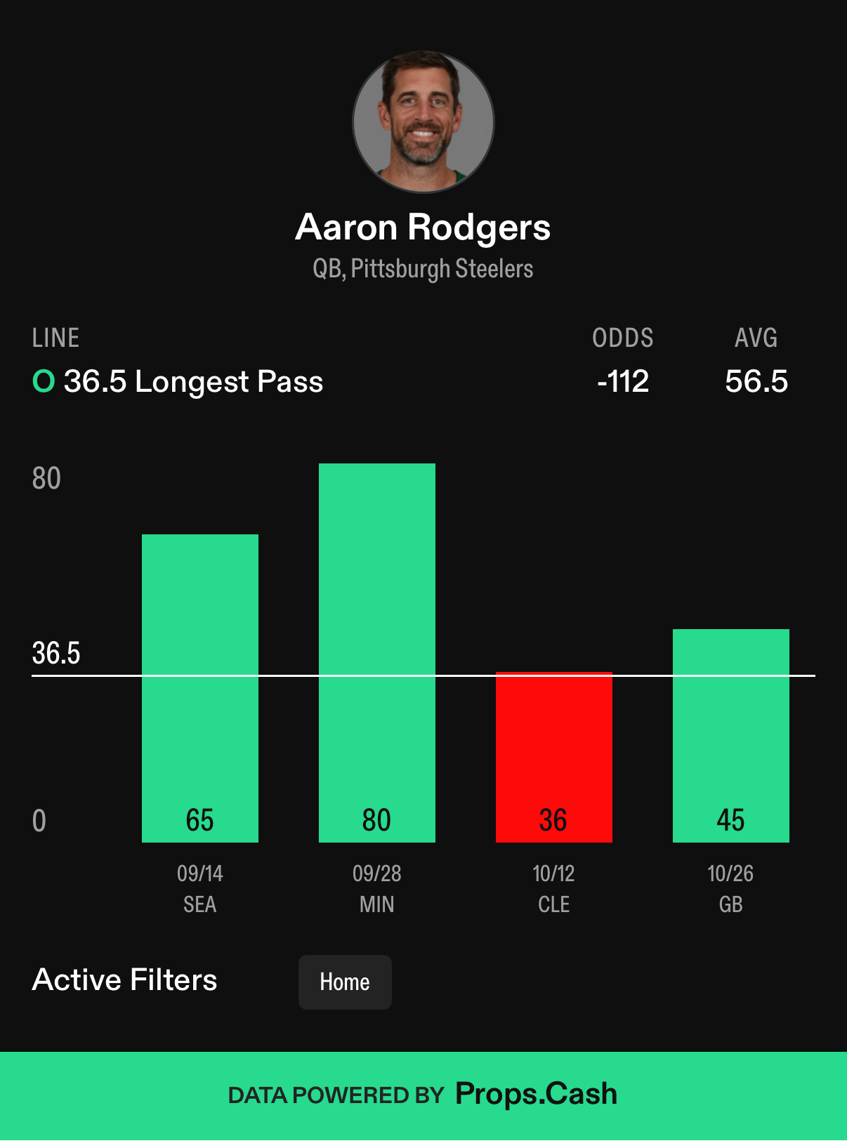 Aaron Rodgers’ longest pass prop is the top trend by Edge on the Props.Cash app for this game.