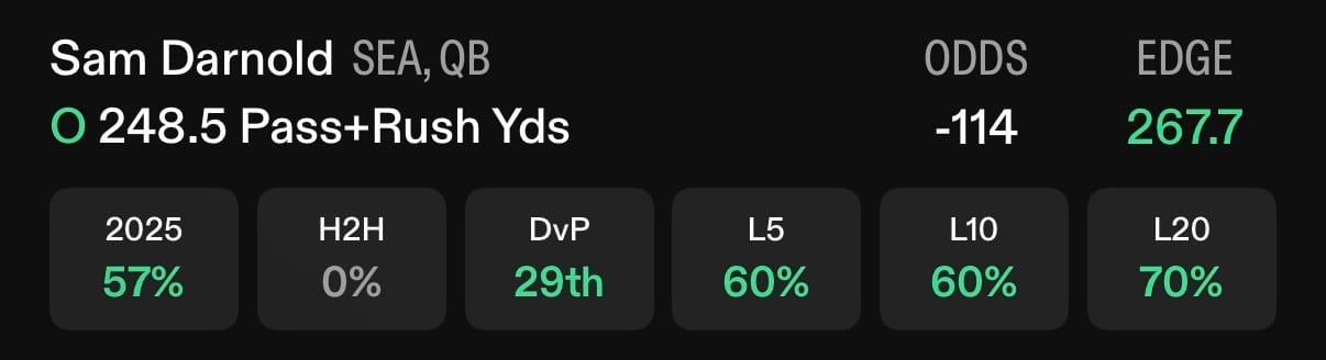 Sam Darnold's passing and rushing combo prop is the top trend by Edge on the Props.Cash app for this game.