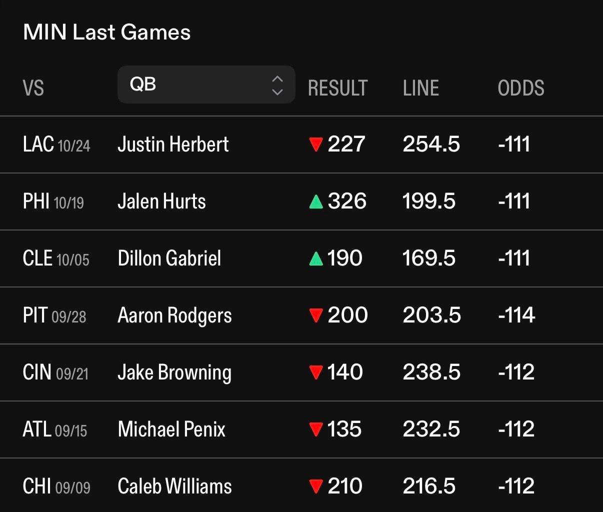 He’s in tough against a Texans pass defense that ranks 4th this season, and has held 3 of the last 4 quarterbacks they’ve faced to under 200 yards (Mac Jones, Cooper Rush, Cam Ward). The quality quarterbacks they’ve faced - Sam Darnold, Trevor Lawrence, Baker Mayfield, and Matthew Stafford - have averaged 223.75 yards against them this season, with all 4 at least having 213.