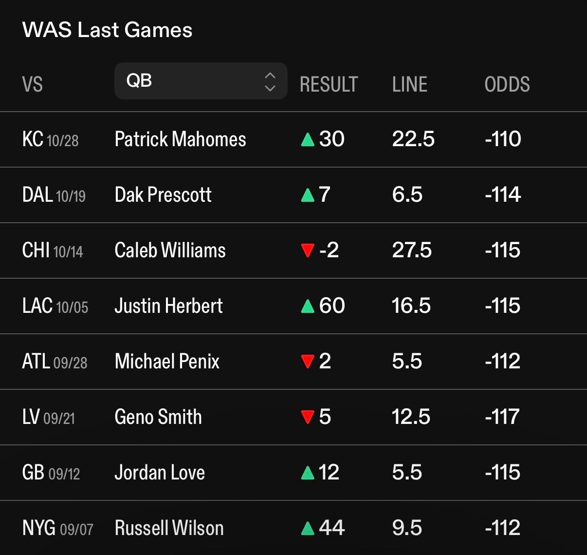 If Darnold scrambles, he should get the yards on the ground to close this out. Every quarterback the Commanders have faced, except for Caleb Williams (-2 yards) and Michael Penix (2 yards), has gotten at least 5 yards on the ground. That includes QB’s that don’t often run: Dak Prescott (7), Geno Smith (5), and Jordan Love (12).