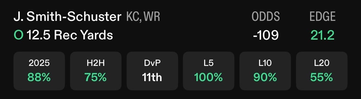 Juju Smith-Schuster’s receiving yard prop is the top trend by Edge on the Props.Cash app for this game.