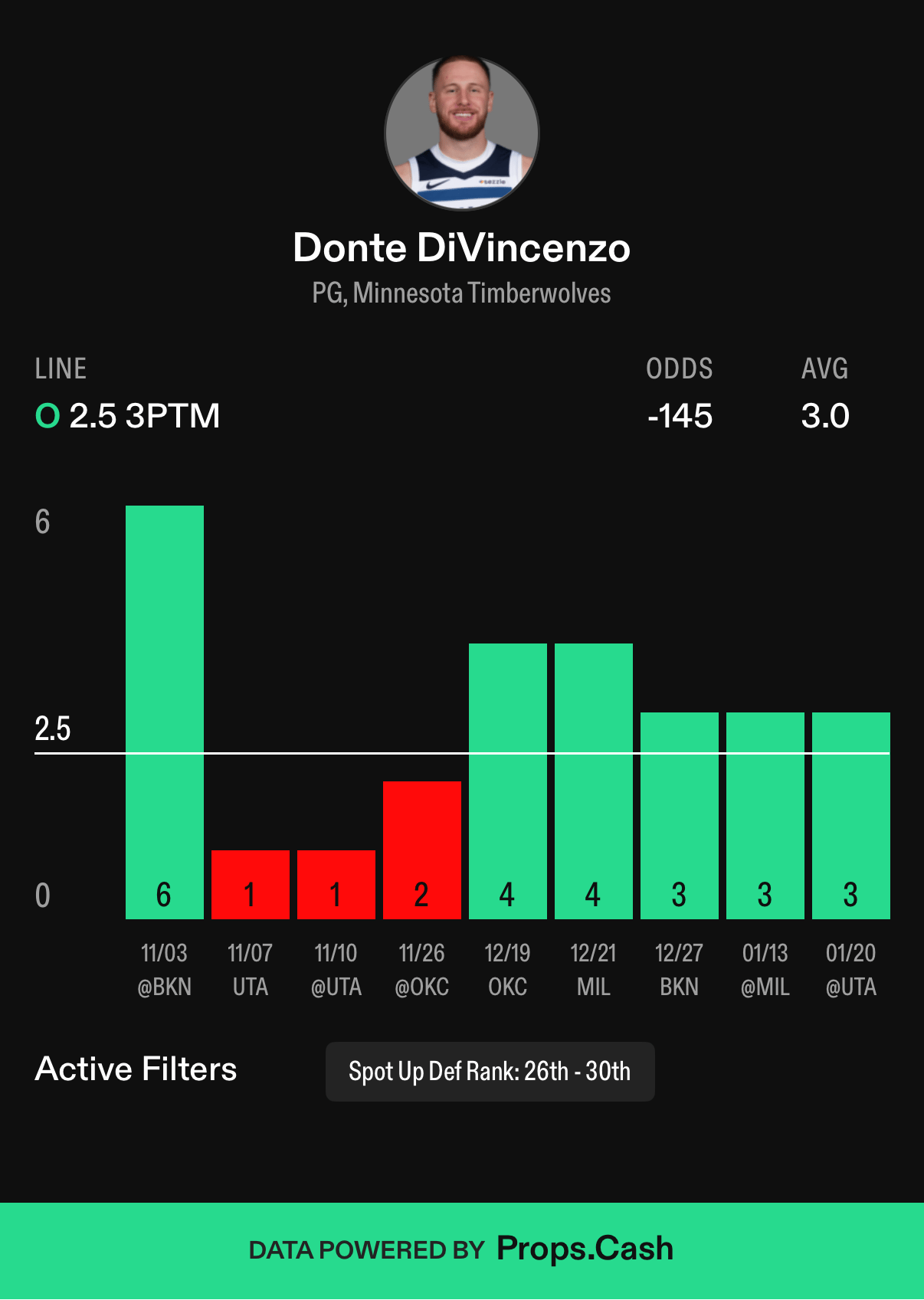 He’s also playing OKC, who rank 21st in 3-point defense against opposing point guards, with 53% of opposing PGs clearing their line against OKC in their last 10 games. OKC also ranks bottom 5 in spot-up defense, where Donte scores 37.2% of his points. When DiVincenzo plays bottom 5 spot-up defensive teams, he averages 3.0 makes with a 67% hit rate.
