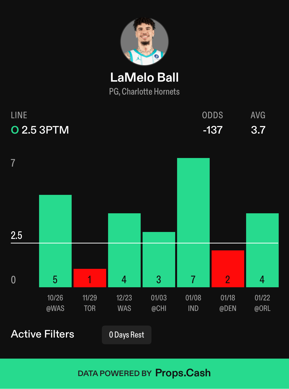 Just like DiVincenzo, Ball has been lacing it lately. Over his last 4 games, he’s averaging 3.25 makes per game with a 75% hit rate. On the road, he’s been particularly hot, averaging 3.7 makes with a 70% hit rate over his L10 on the road. And also like Donte, he has outstanding data in back-to-backs.