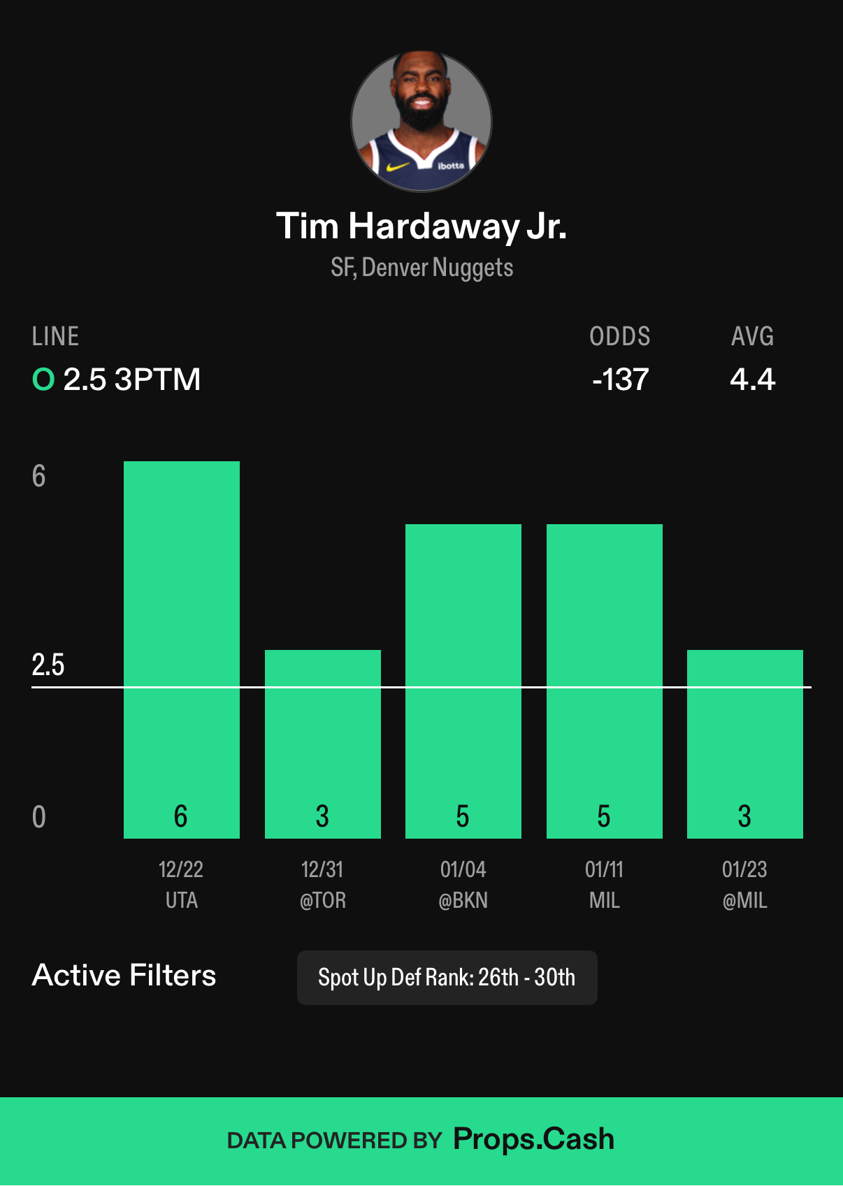 100% hit rate, averaging 4.4 made threes. Build on that tonight, Tim.