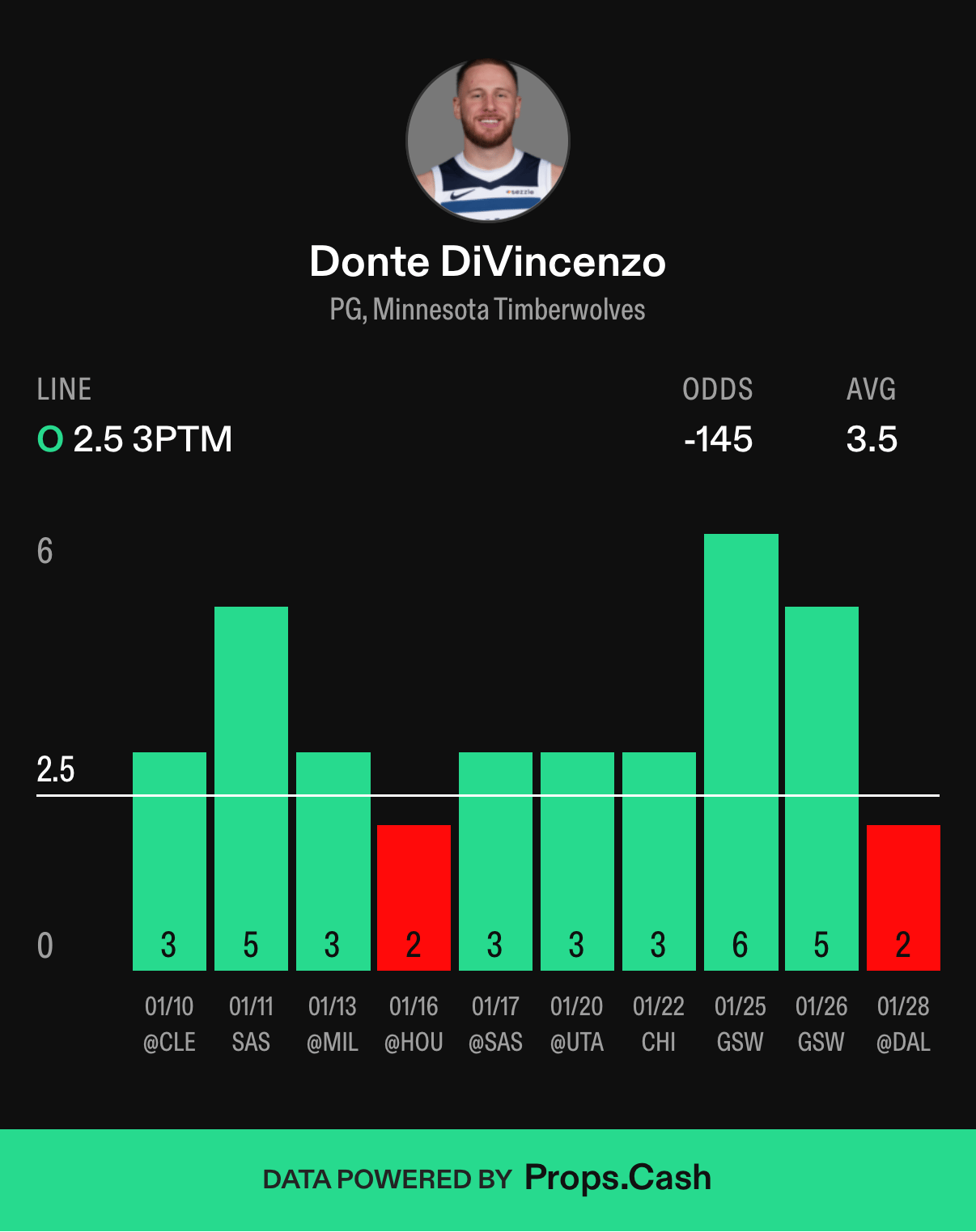 DiVincenzo is averaging 3.1 makes per game this season, with a 69% hit rate, and more recently, he’s absolutely lacing it from three. Over his last 10 games, he’s averaging 3.5 makes with an 80% hit rate. Over his last 20, he’s averaging 3.2 makes with a 70% hit rate.