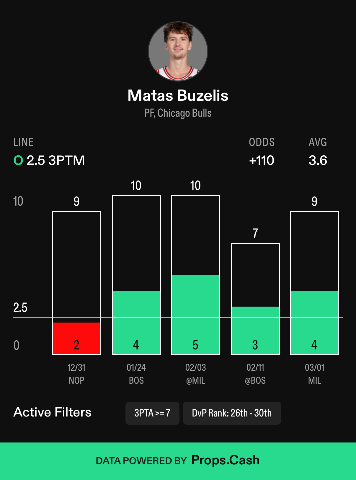 3-4 3PTA (18 games): 0.9 average, 67% hit rate