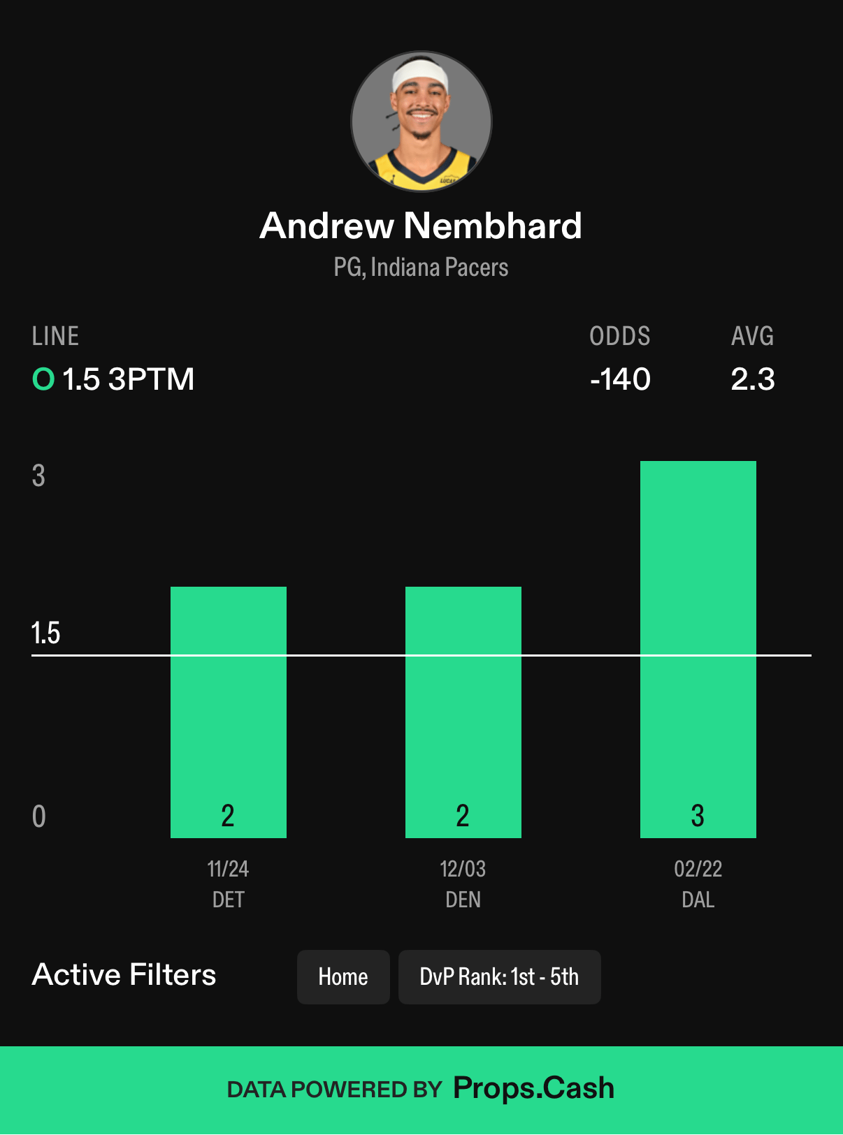 And now we mix in that matchup data. The Phoenix Suns rank 4th in 3-point defense against opposing teams’ point guards - a tough matchup for Nembhard, or is it? In his 6 games this season against the top 5-ranked 3-point defenses, Nembhard has averaged 1.8 made threes with a 67% hit rate. And then we add back in those home splits…
