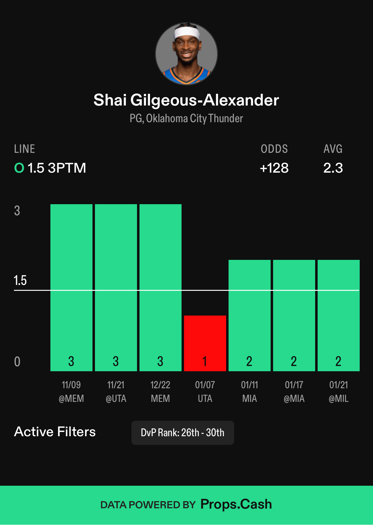 BOS @ OKC: Shai Gilgeous-Alexander, 1.5 3PTM