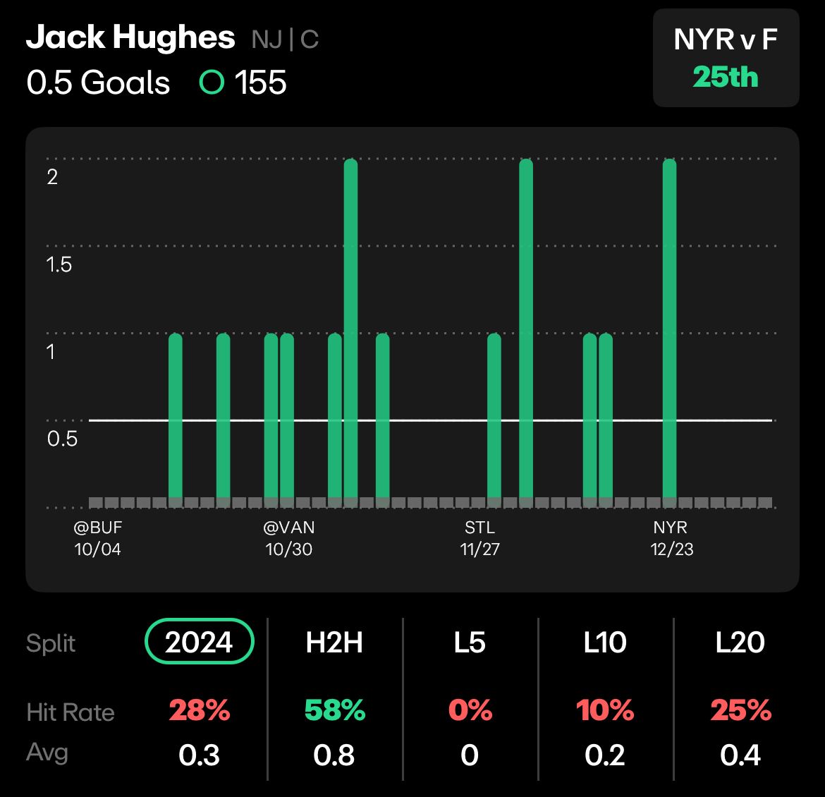 Hughes has had a tough go lately, but history suggests he could be due for a breakout game. In his last two games against the Rangers, he scored 4 goals, and he’s found the net in 5 of his last 9 games at Madison Square Garden. Can a big rivalry help him find the back of the net?