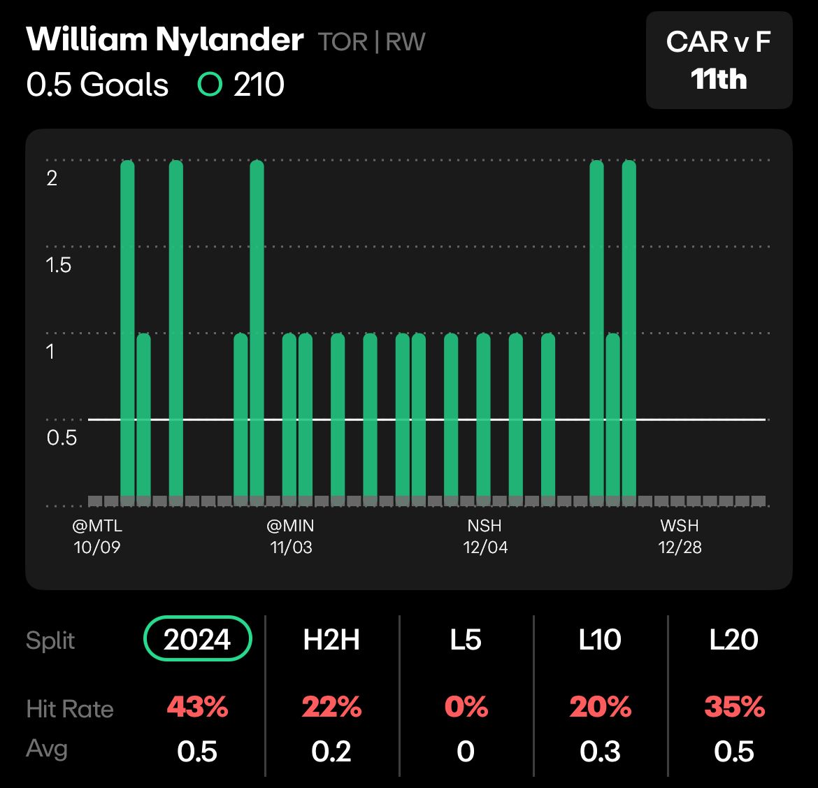 Nylander has struggled to find the back of the net recently, scoring in just 7 of 18 games this season (a 39% hit rate). Carolina isn’t one of the league’s worst defensive teams, but they’re certainly not elite either. Will Nylander break his skid tonight?