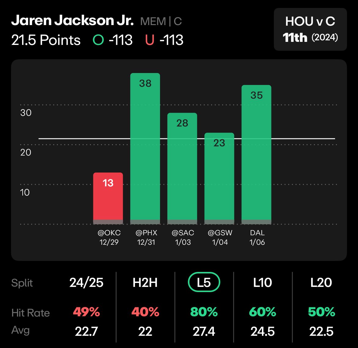 Jaren Jackson has averaged 29 minutes per game this season, but over his last 5 games, he’s seen that jump to 33.5 minutes per game. When logging 33 or more minutes this season, Jackson has gone over his points line 100% of the time, averaging 30.4 points per game. With Houston allowing 21.09 PPG to centers (11th in the league) and 22.23 PPG to power forwards (14th), tonight could be another high-scoring night for Jackson.