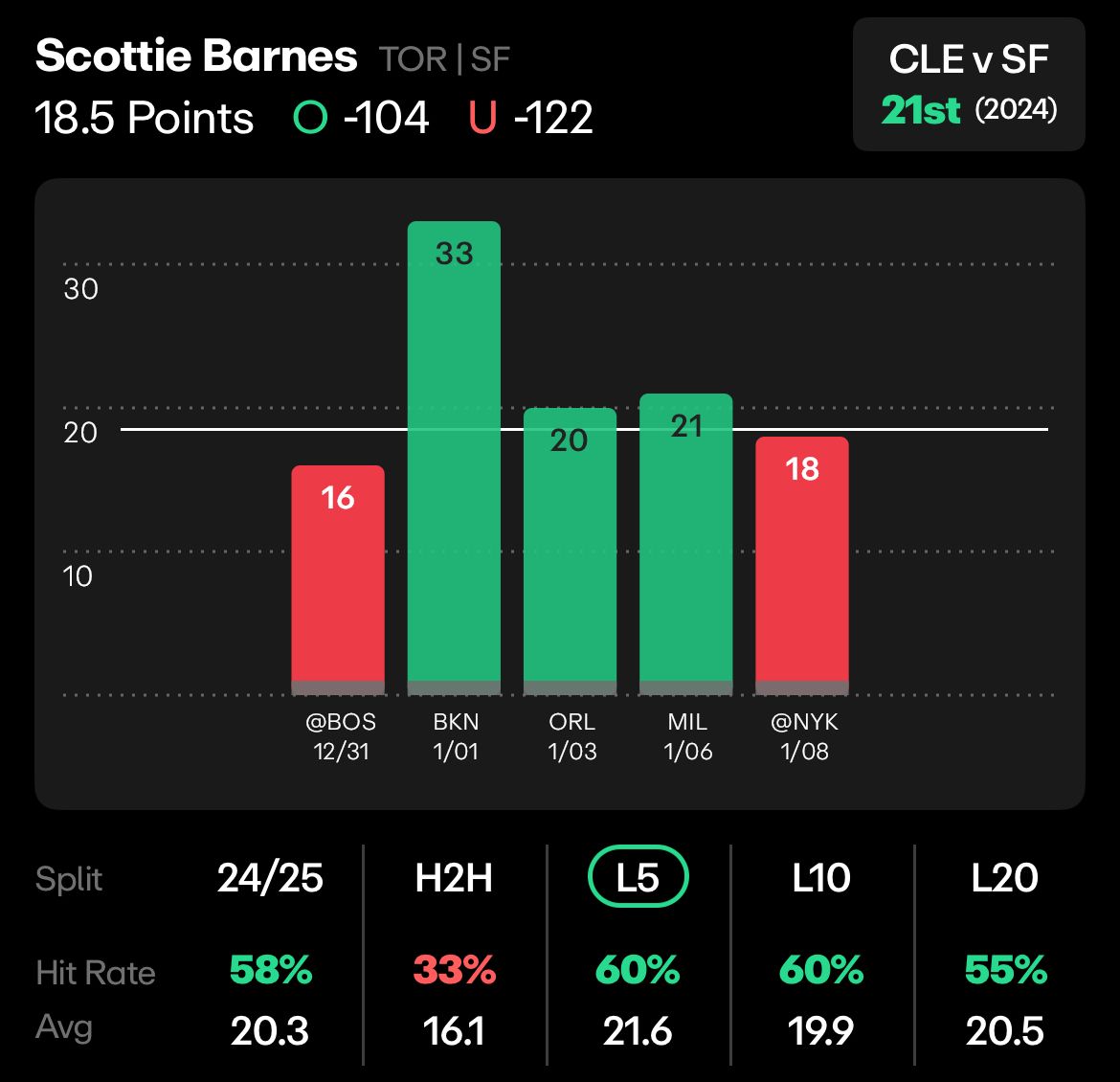 Barnes has been consistently exceeding his points line, and his solid performances in back-to-backs are encouraging. The Cavs allow 21.6 PPG to small forwards (21st in the NBA).