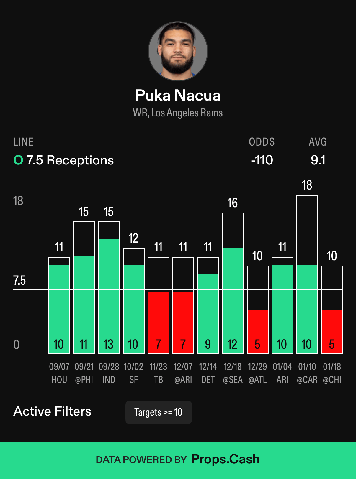 Yes, he was quiet last weekend with 5 receptions on 10 targets. But the targets were still there, and with 10 or more targets this season, he’s averaging 9.1 receptions with a 67% hit rate.