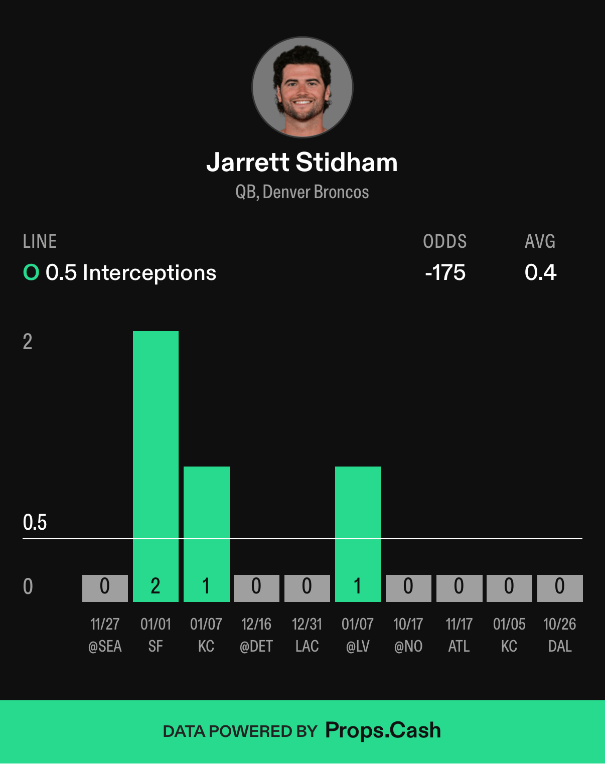 Lastly, there’s no individual data for Stidham we can really trust. He’s barely played this season. But he has four interceptions over his last three NFL starts; however, those games were in 2023 and 2024.