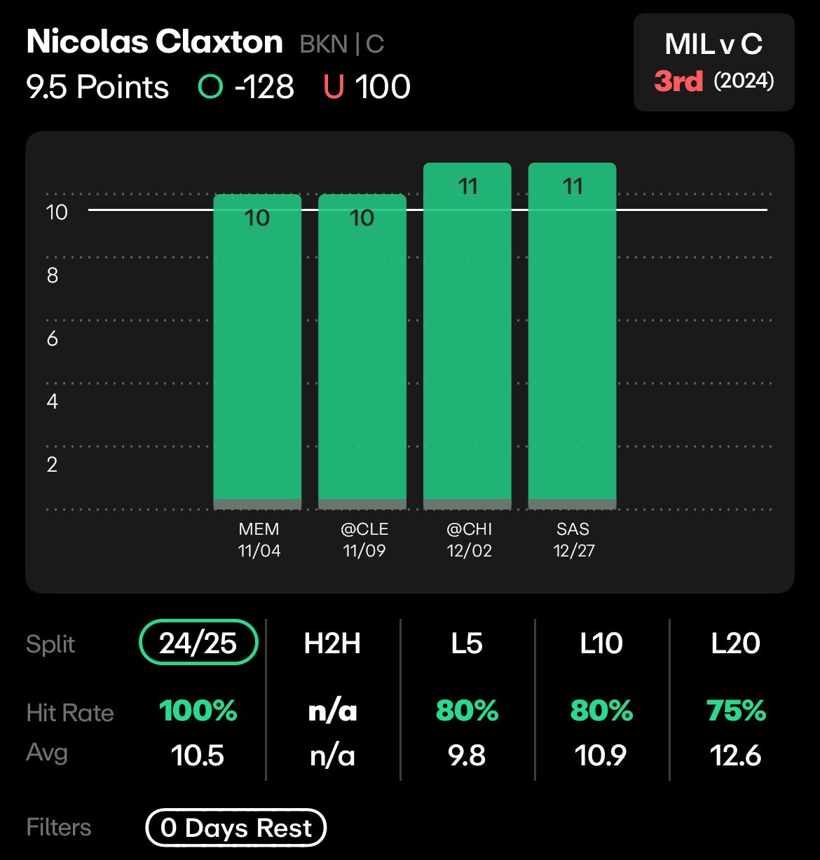 Claxton has solid H2H data vs Milwaukee, dating back to 2021 but also in all 3 games this year