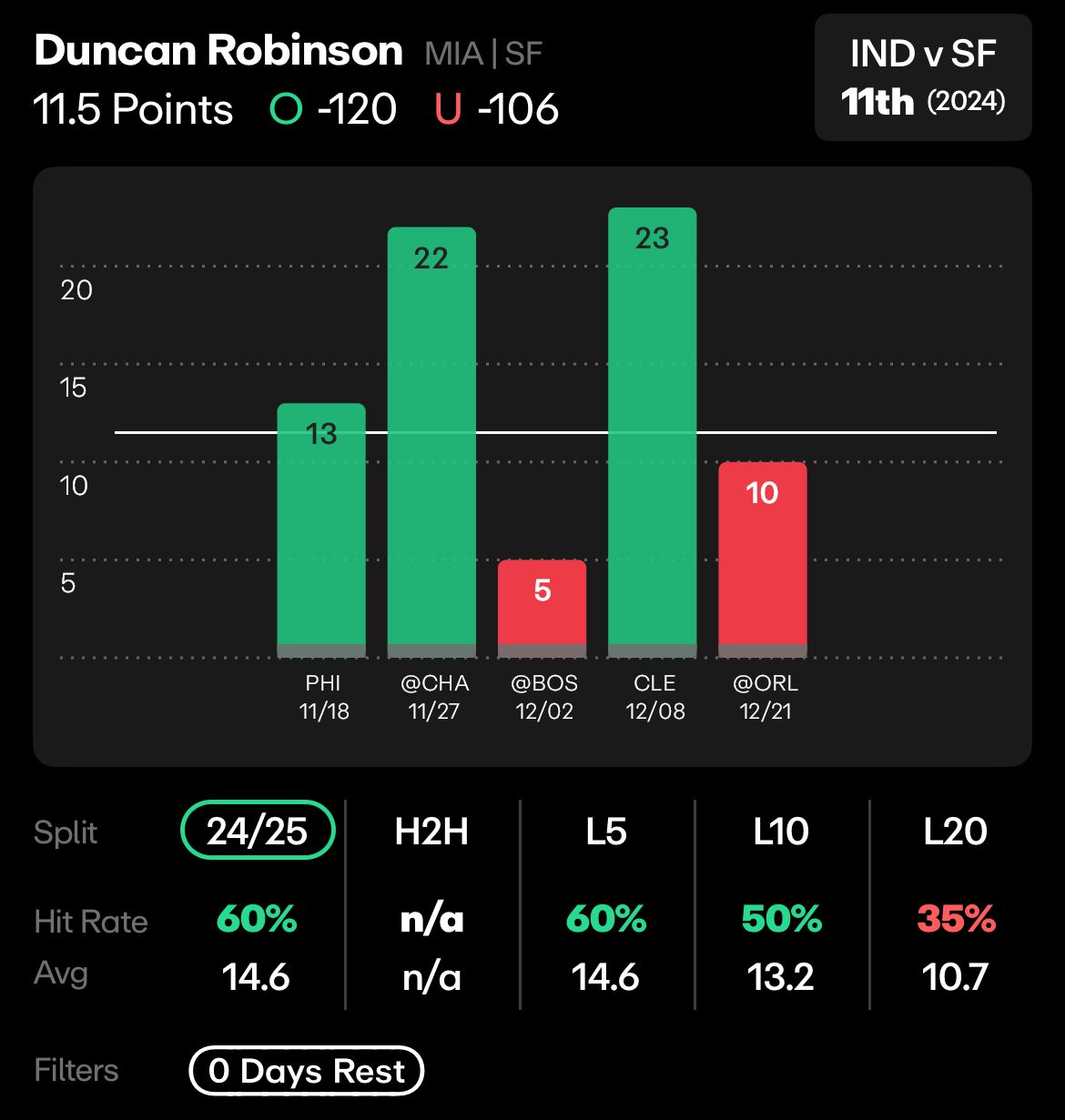 And Robinson’s data versus the Pacers in his career is pretty noteworthy, averaging 13.9 points in his last 9 matchups against them, with a 20-point game vs the Pacers in November.