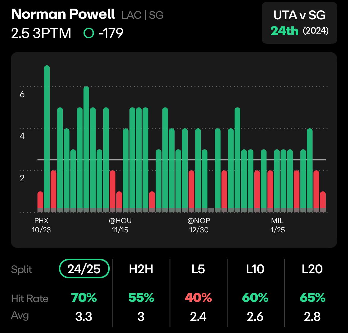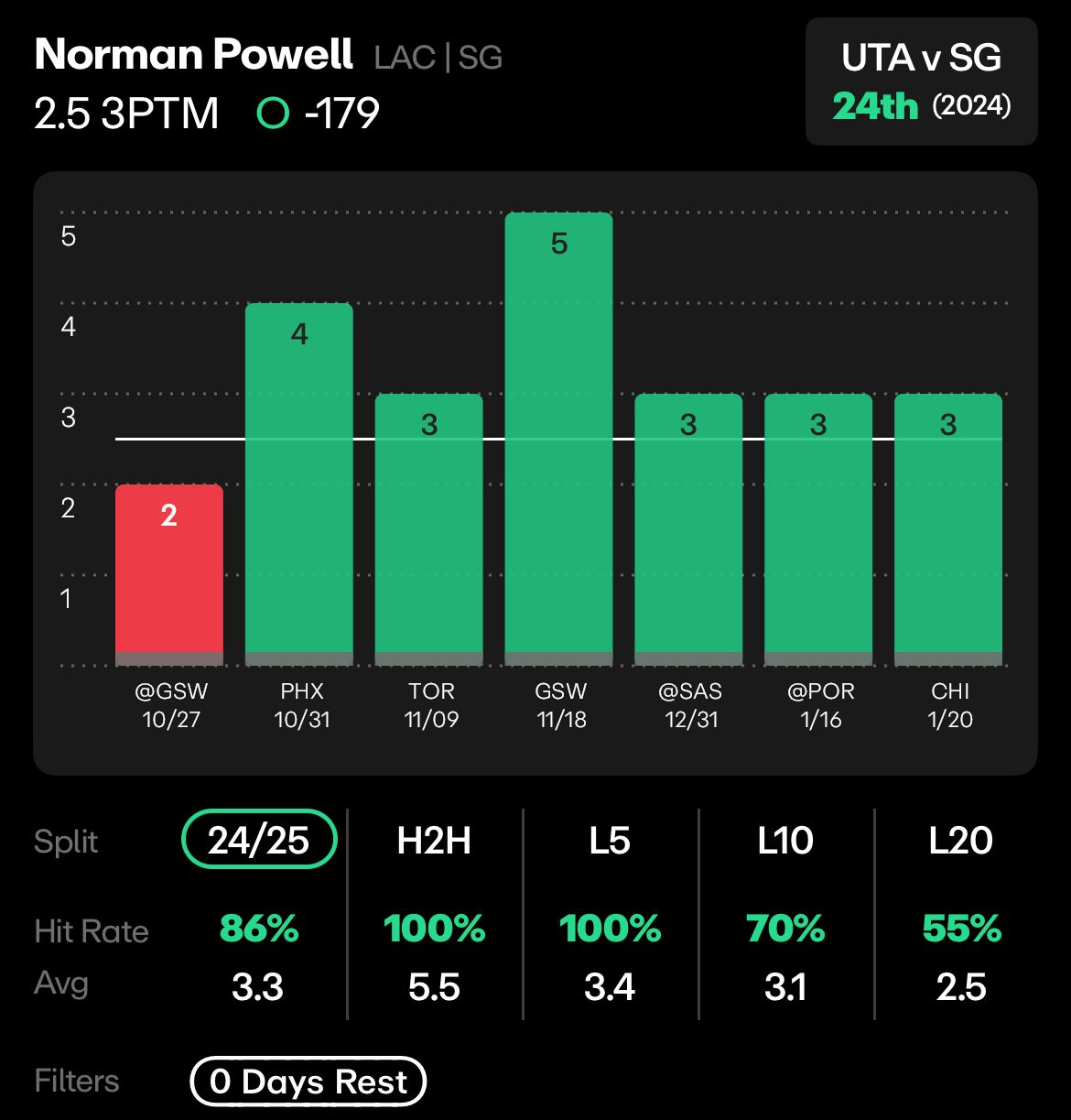 Two facts about Powell’s season; he’s been over in 70% of his games this season, averaging 3.3 threes. And although he’s been under this line in back-to-back games coming into this one, and hasn’t gone under this line in three straight all season.
