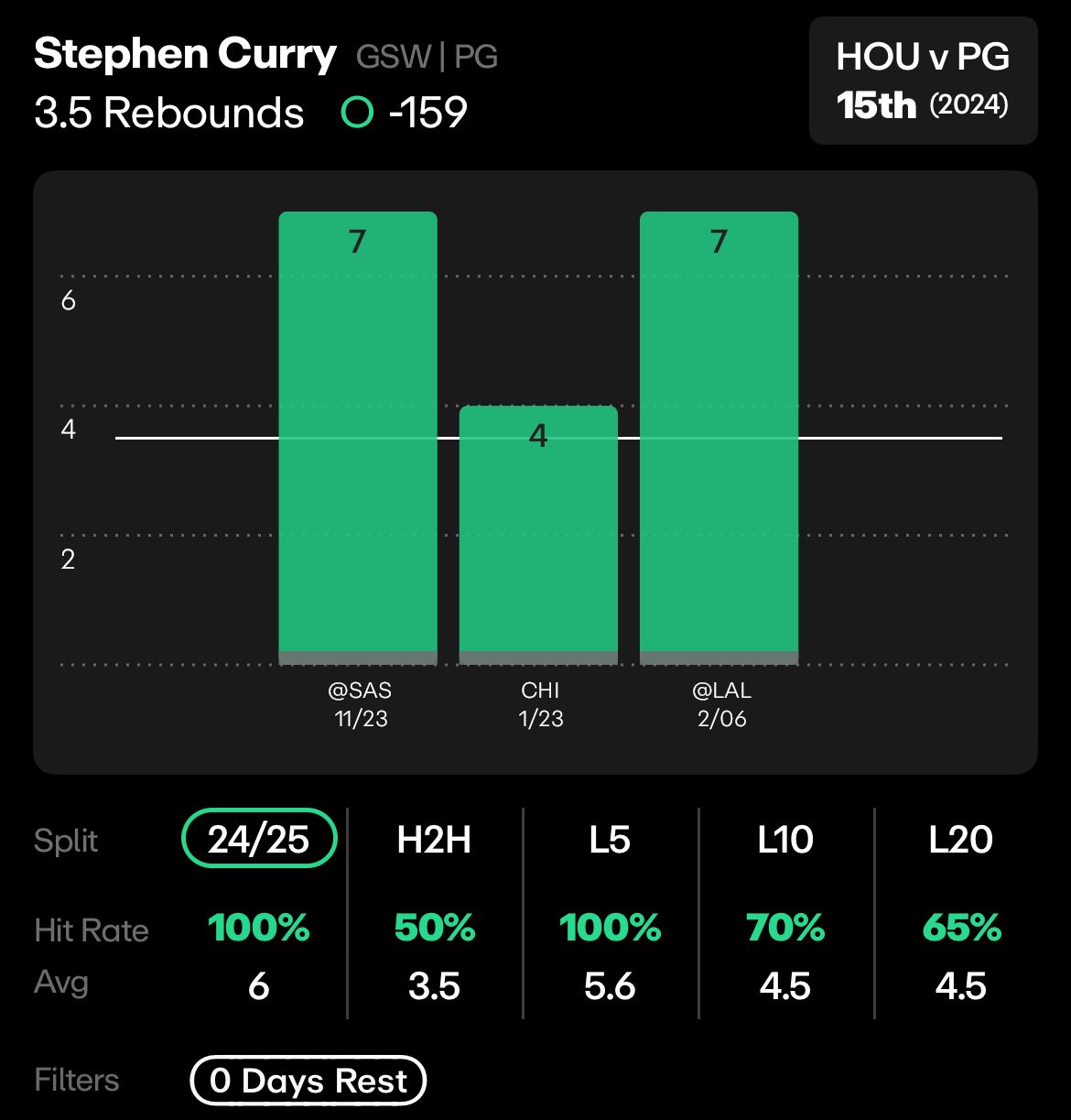 Steph’s rebound line tonight is 3.5, and in all three back-to-backs this season, Steph has gone over this line is 7, 4, and 7 boards.