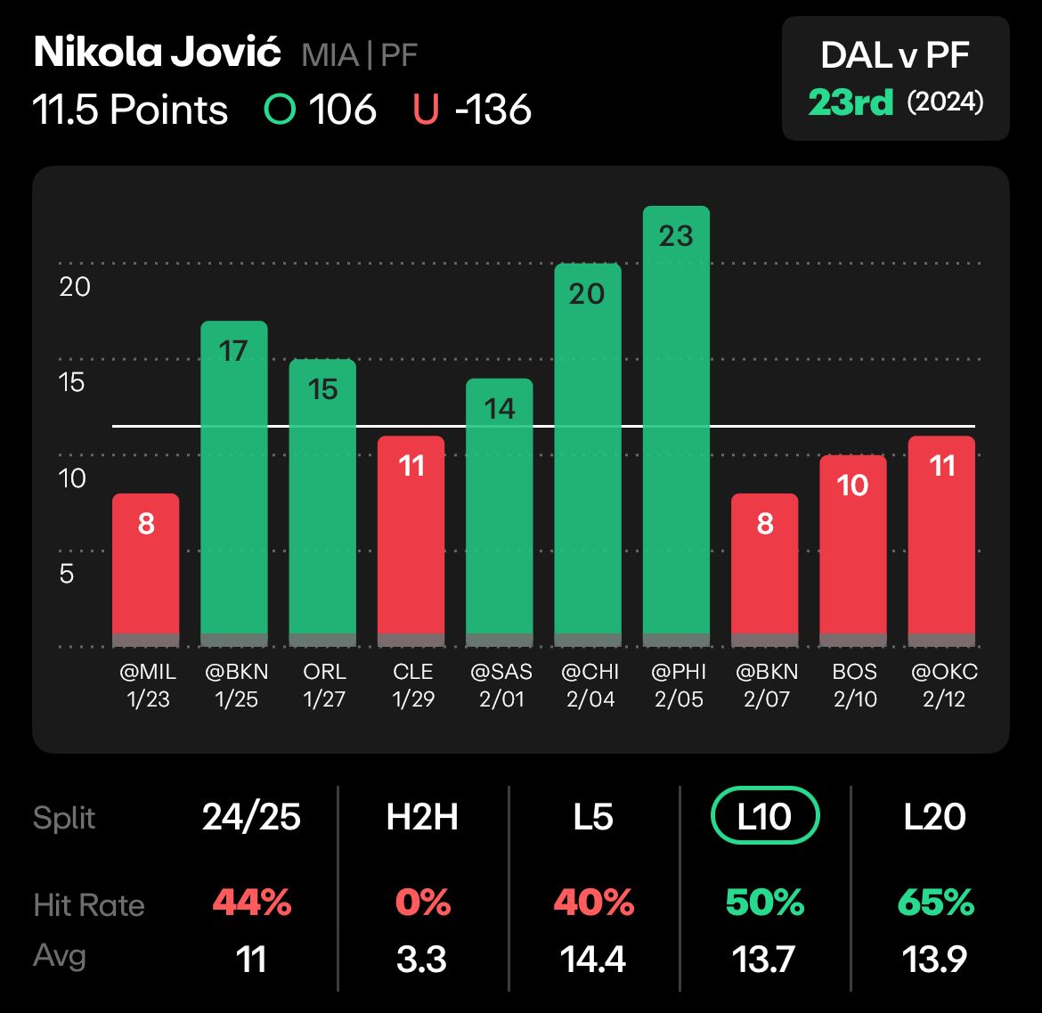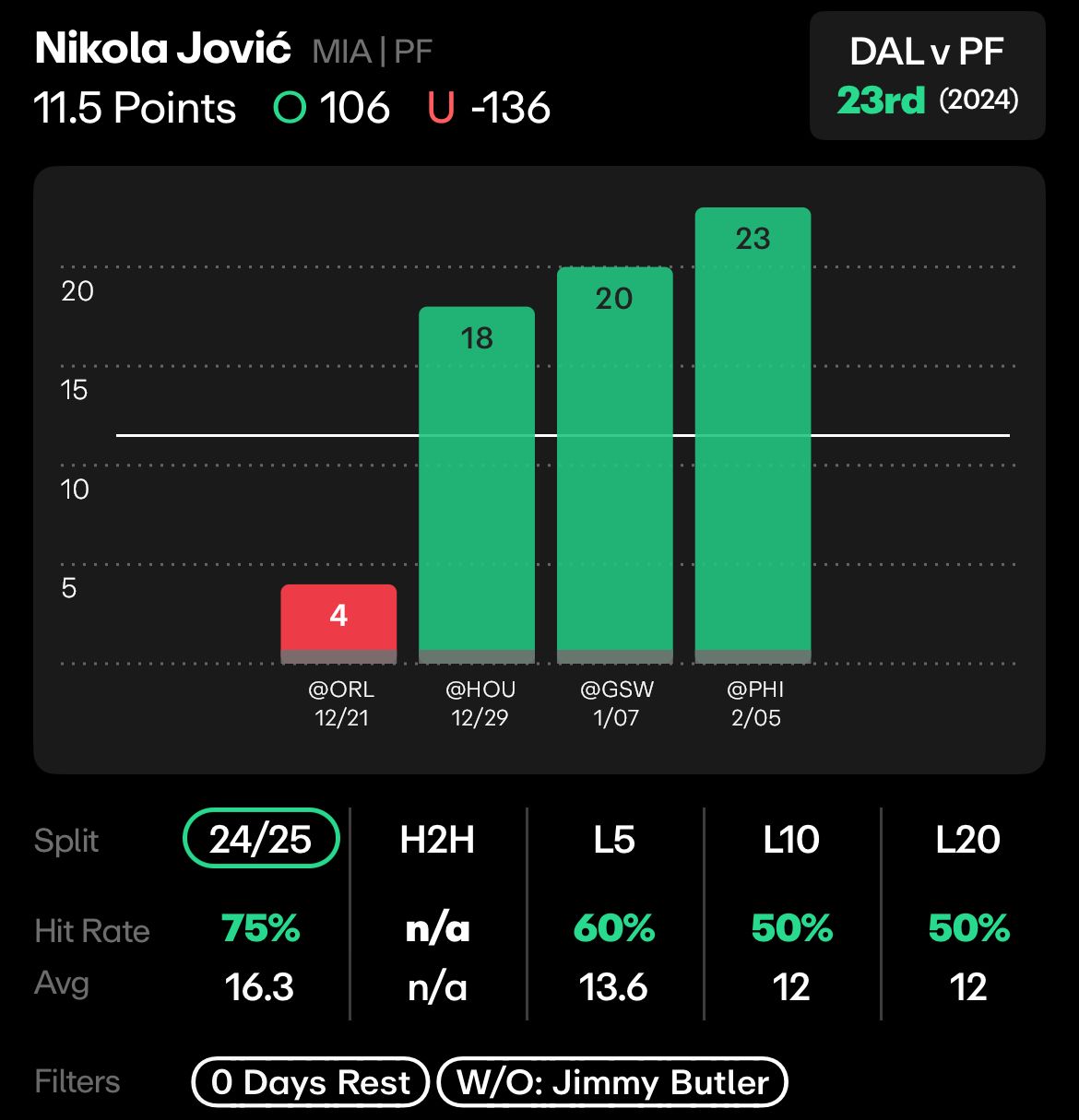 If you look at Jovic’s back-to-back data overall this season, it’s meh. He’s been over this number in 3 of 6 games, averaging 12.7. BUT, in back-to-backs without Jimmy Butler, it’s a different story.