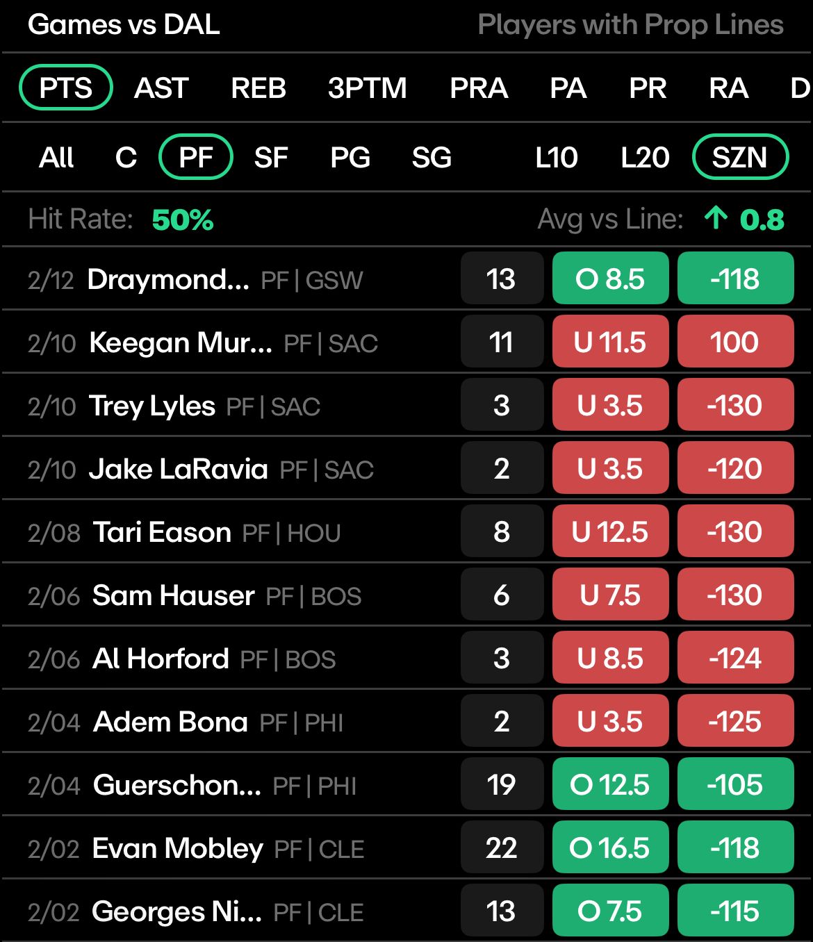 Power forwards are averaging 23.47 points against Dallas this season, with 44% going over their points line against the Mavs over their last 10 games, and 50% going over their line this season.