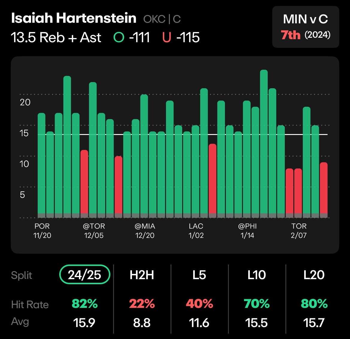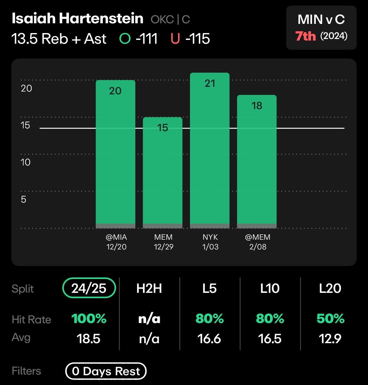 Hartenstein has been a monster in back-to-backs this season against this line, averaging 18.5 rebounds and assists and going over in all 4 games with zero rest.
