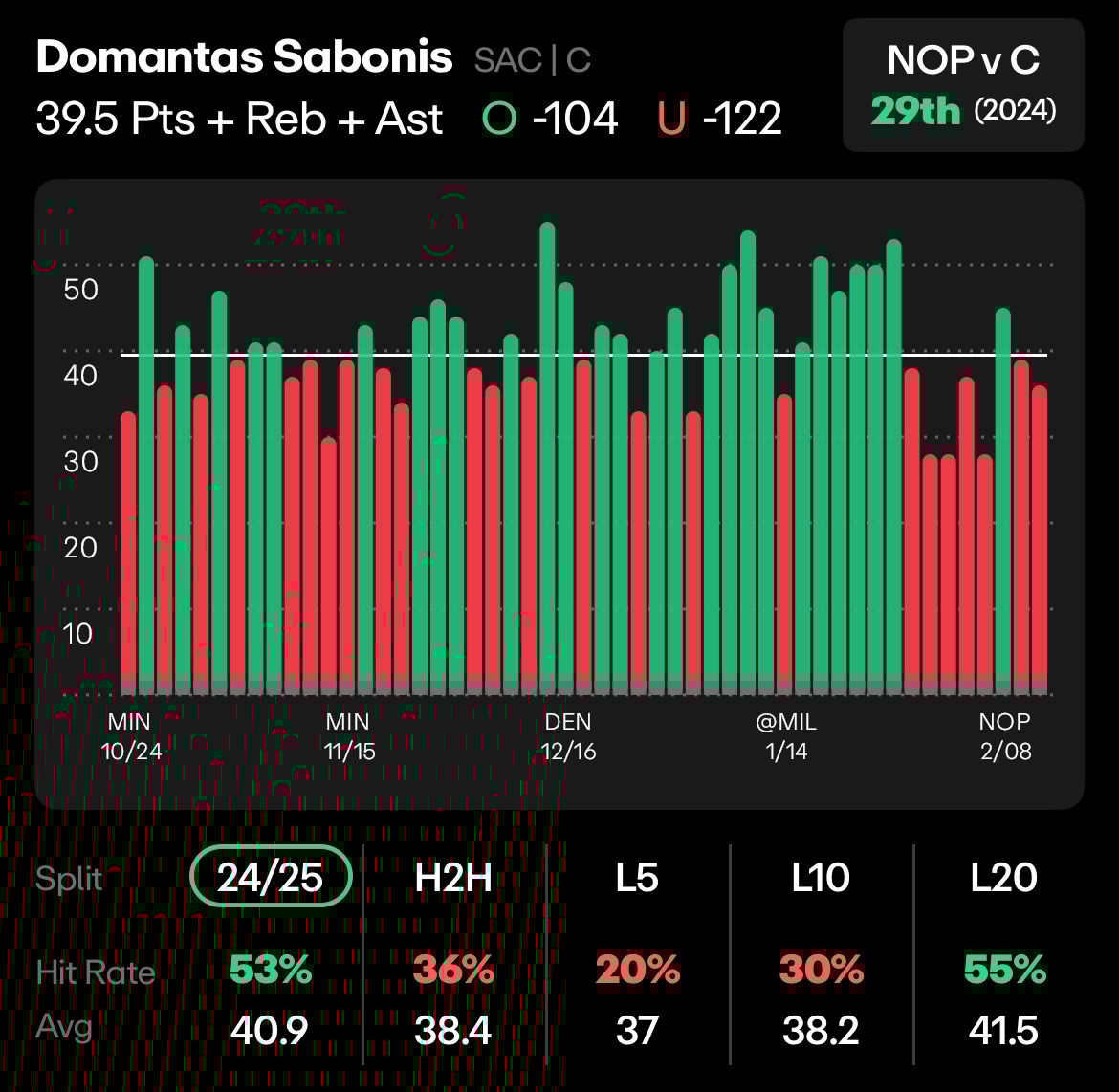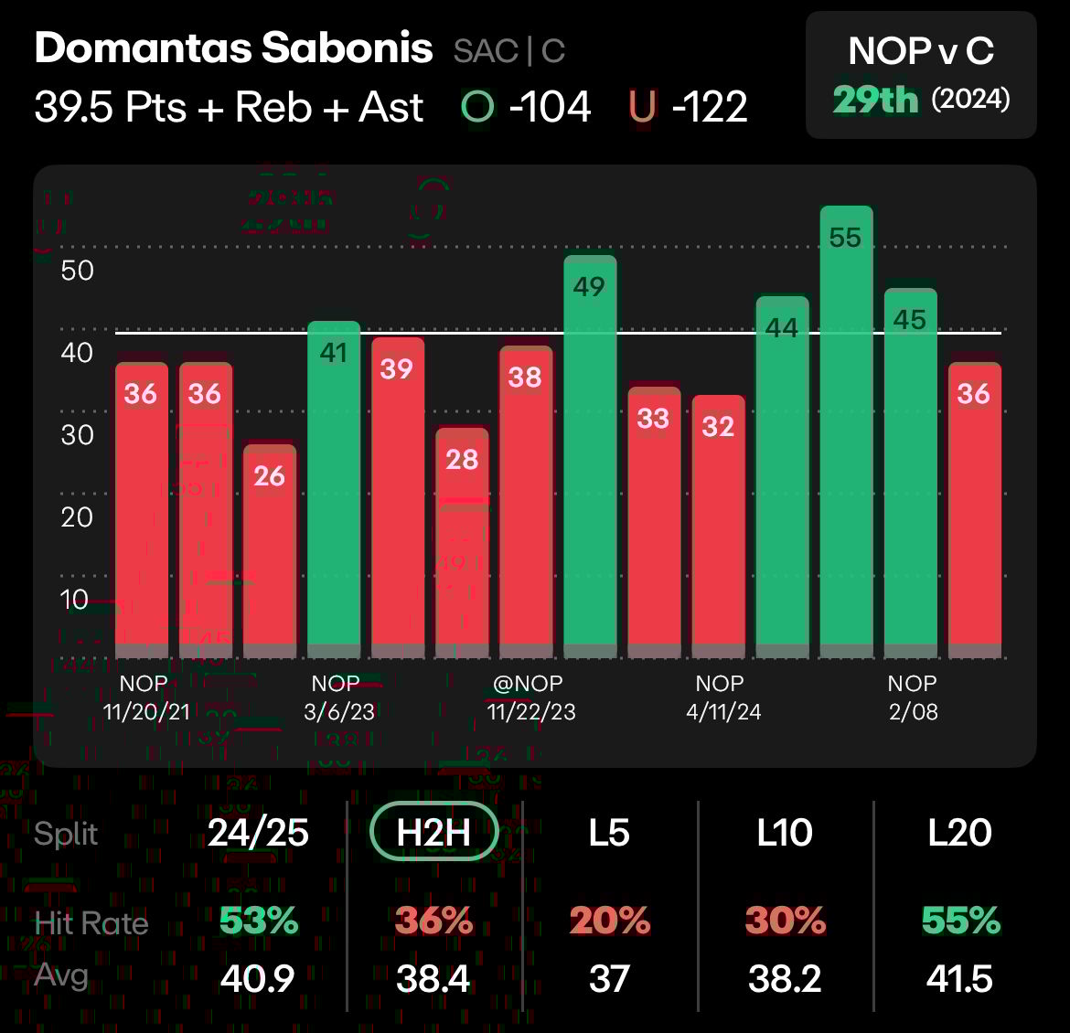 Lastly, Sabonis has averaged 41.3 PRA this season, going over this number in 52% of his games away from Sacramento.