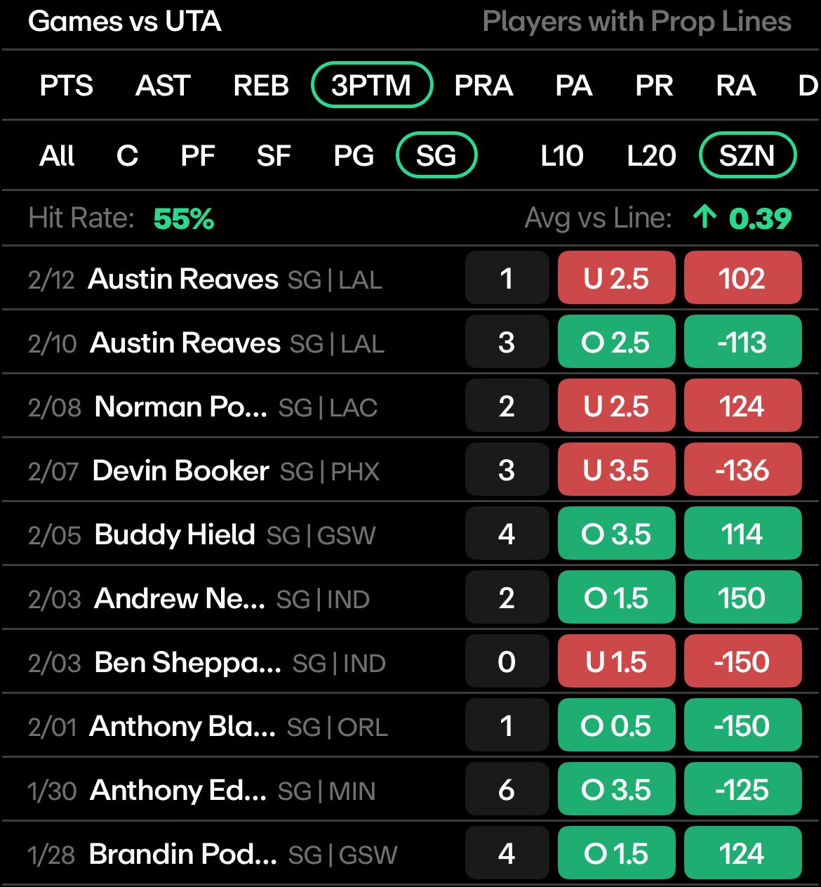 This season against Utah, Powell has 11 threes in three games, going over this number in 2 of three games. The Jazz allow 3.56 threes per game to shooting guards, 7th most in the NBA, with 55% of all shooting guards going over their number against the Jazz this season.