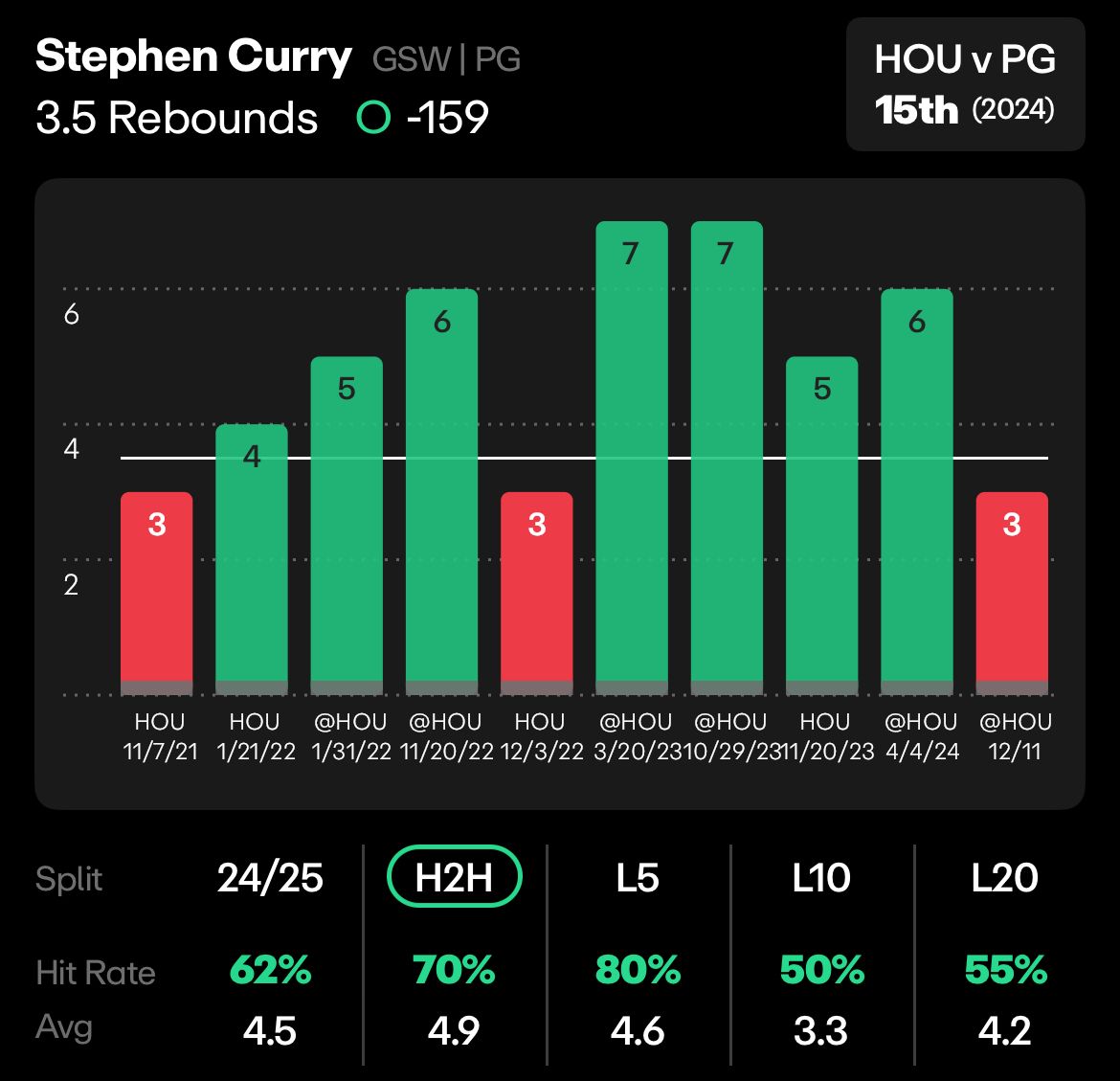 Point guards are averaging 6.08 rebounds per game against the Rockets this season, with 47% of point guards going over their line versus Houston in the last 10 games, 45% going over in their last 20 games and 42% going over this season.