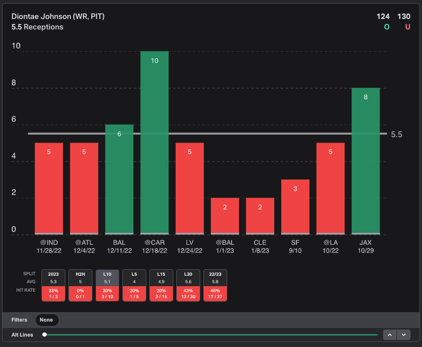 Take Pittsburgh’s Diontae Johnson as an example, his 5.5 receptions line is the highest of the night tonight. You certainly could bet his over, it’s an inviting matchup, but it’s at least worth seeing how Johnson performs when he does see this type of volume, an ability made easy on props.cash.
