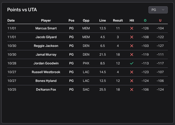 A slight scroll down when you click on any player’s chart brings you to this table. You can filter by any of the five positions you’d like to study, and the above is available for every single NBA prop.