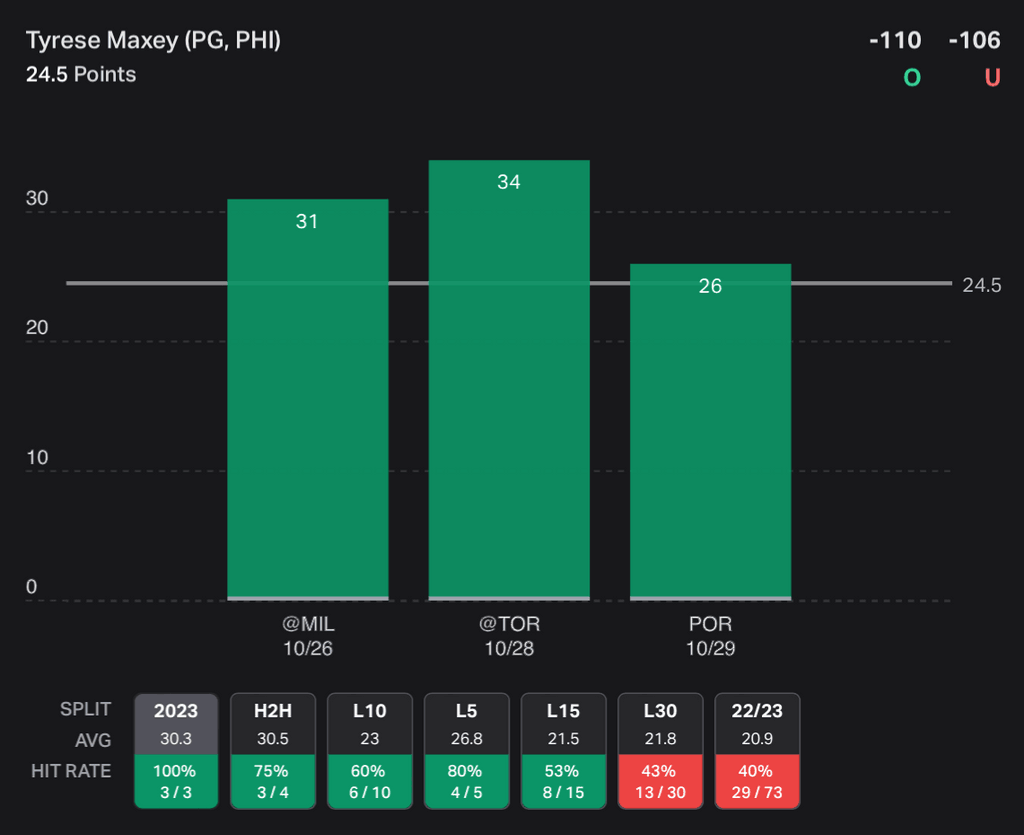 Tyrese Maxey is over his “Points” prop in three straight games – Across this span, Maxey is averaging 30.3 Points/G on 18.7 FGA/G. He faced off vs TOR four times last season, and was able to record 25+ Points in three of four.