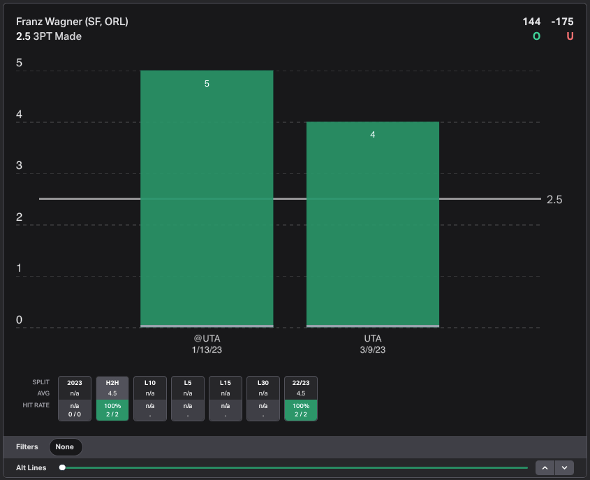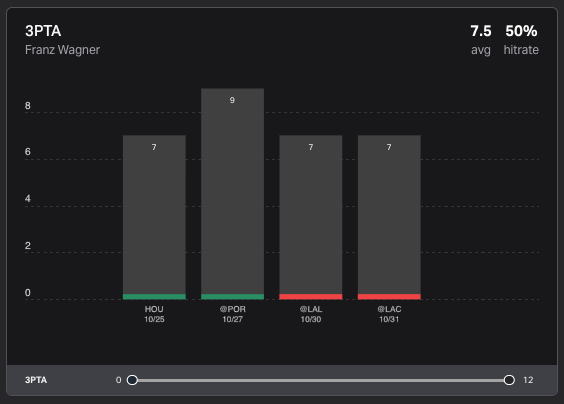 One could use that to start exploring Franz Wagner in more depth, the Magic’s starting small forward. Wagner has a 2.5 threes line tonight, and in his four games, he’s made 3, 3, 2 and 2. The makes are only one thing, look above at his volume from deep: it’s very much there.
