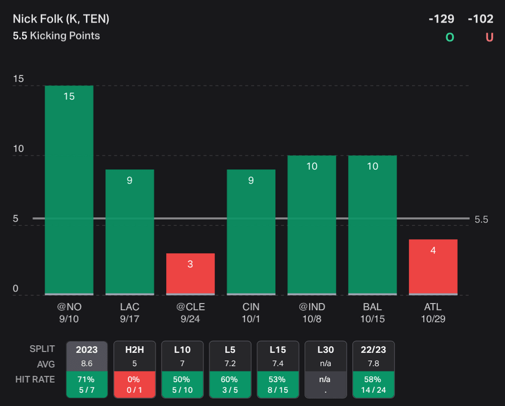Nick Folk has hit his “Kicking Points” prop in five of seven games. Across this span, Folk is averaging just under nine KickingPoints/G. Last season, he played PIT once, but was only able to come away with five KickingPoints. Will Folk have better luck in this one?