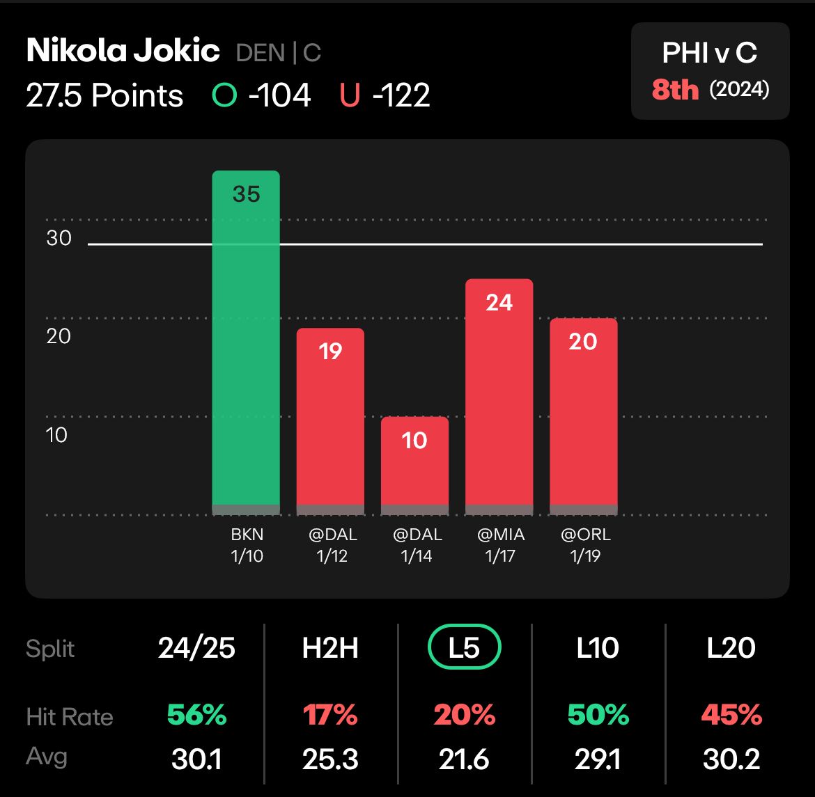 Jokic is averaging 18.25 points per game over his last four games, compared to his season average of 30.1 PPG.