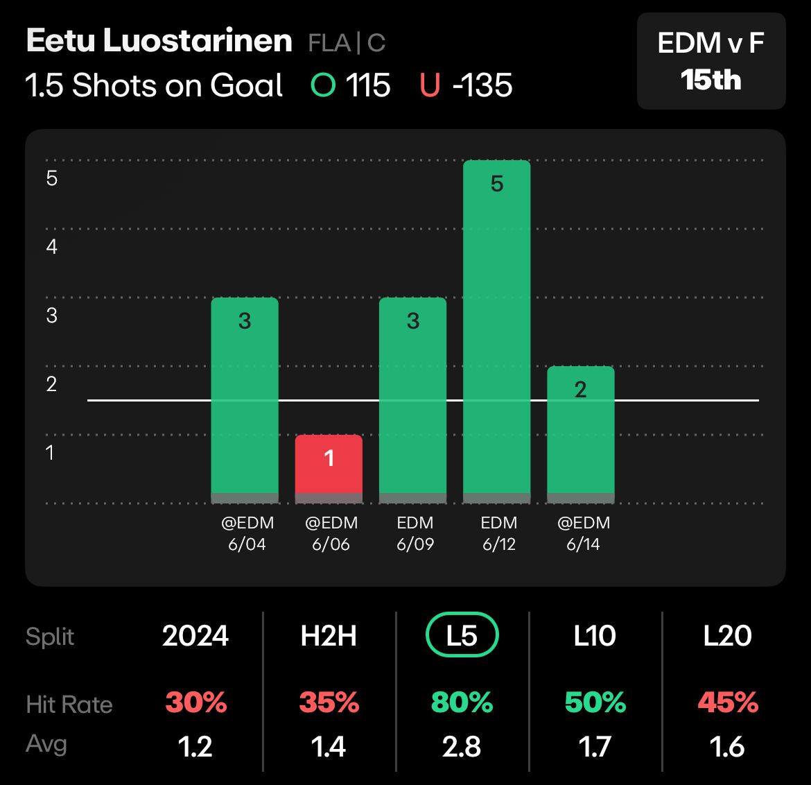Points, assists and goals are all markets that Luostarinen could come through in tonight, but if you’re looking for something a bit safer, he’s also cooked his shots on goal prop in this series.