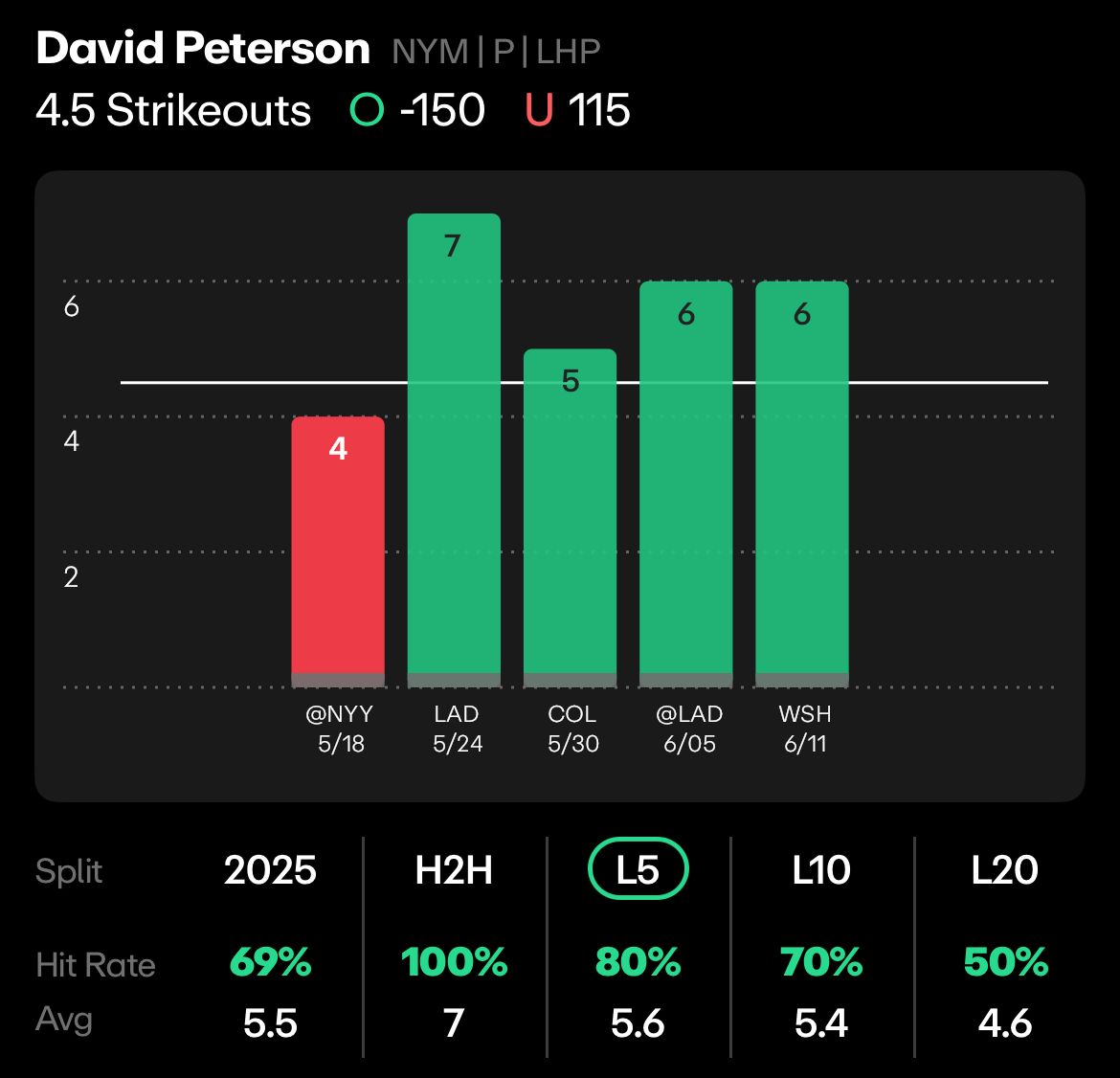 Peterson’s strikeout prop is 4.5 tonight, and although he isn’t an elite strikeout guy (45th percentile), he’s still cleared this line in 69% of his starts this season (averaging 5.5 strikeouts) and Peterson has averaged 6 strikeouts per game in his last 4 starts, going over this number in all 4.