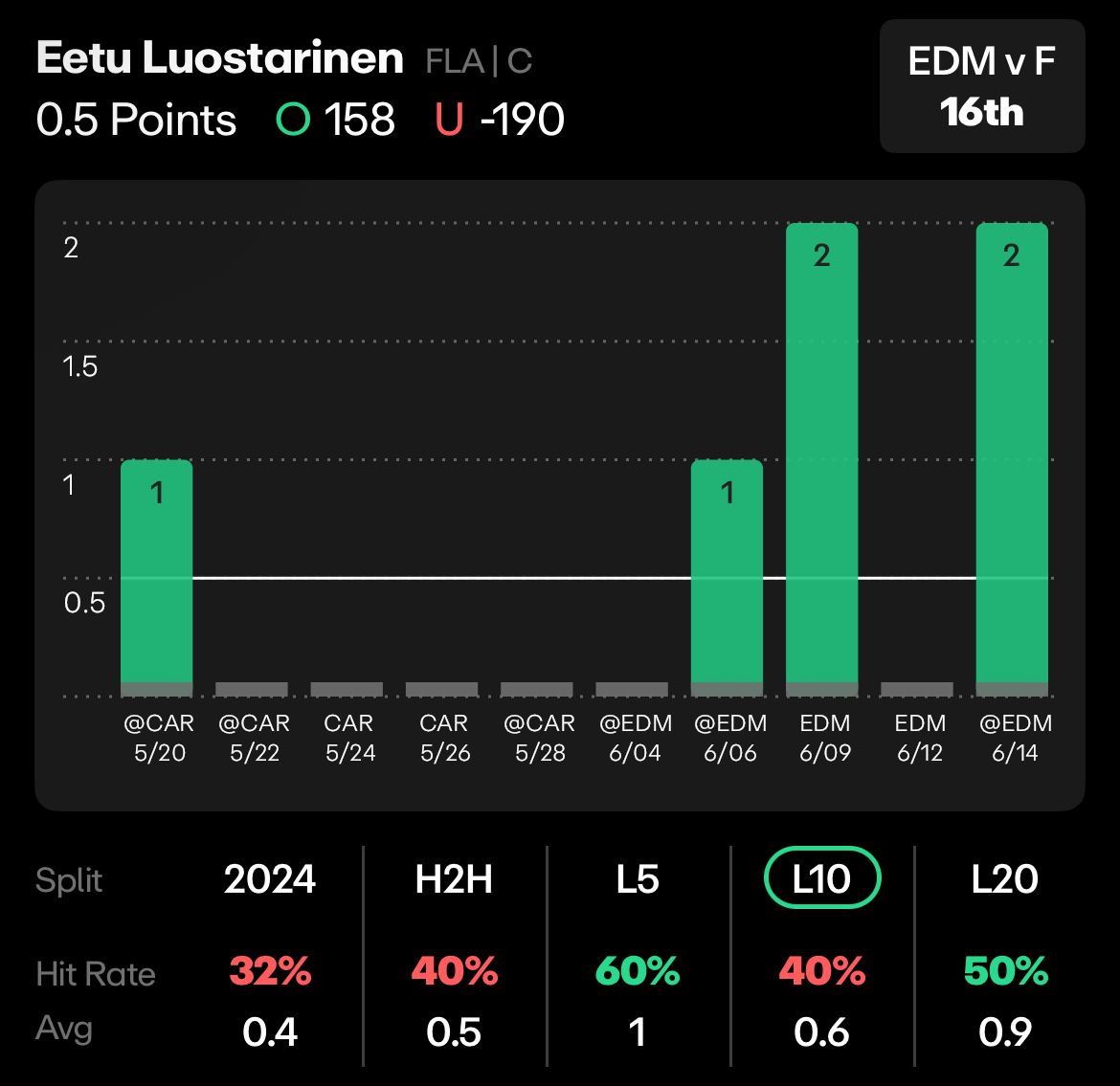 Luostarinen has been dynamite late in the series, with 3 goals and a whopping 7 assists in the Panthers 6 games that were games 5 to 7 in a series these playoffs. Luostarinen has also turned it on after a five-game slump, with 5 points in his last three games of the series.