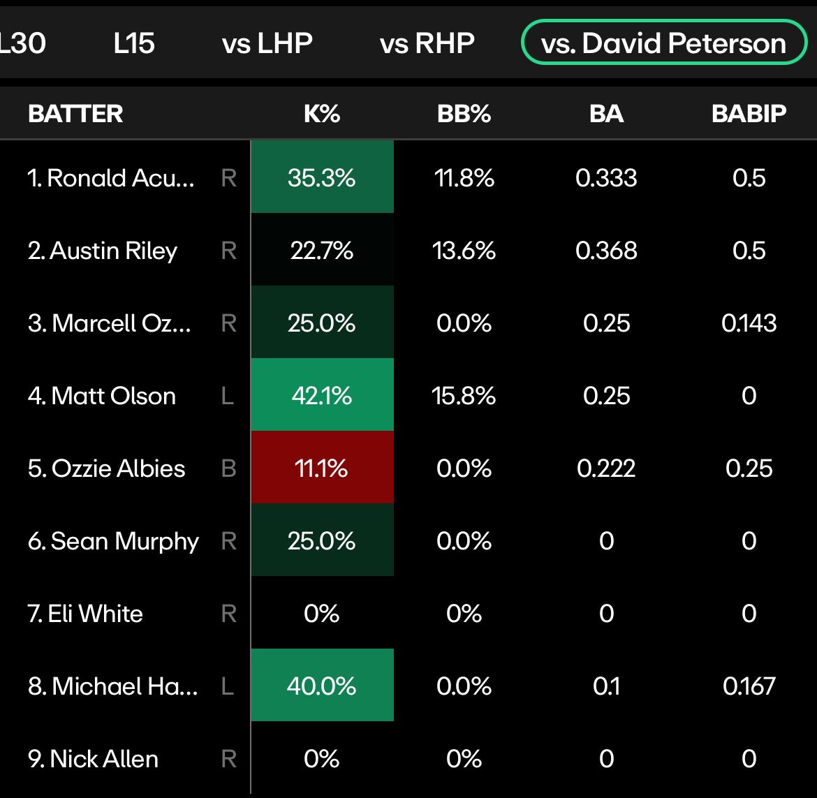 6 players in the Braves’ projected lineup have a K rate that’s 25% or higher vs Peterson, 5 of which have 10 plate appearances or more against Peterson.