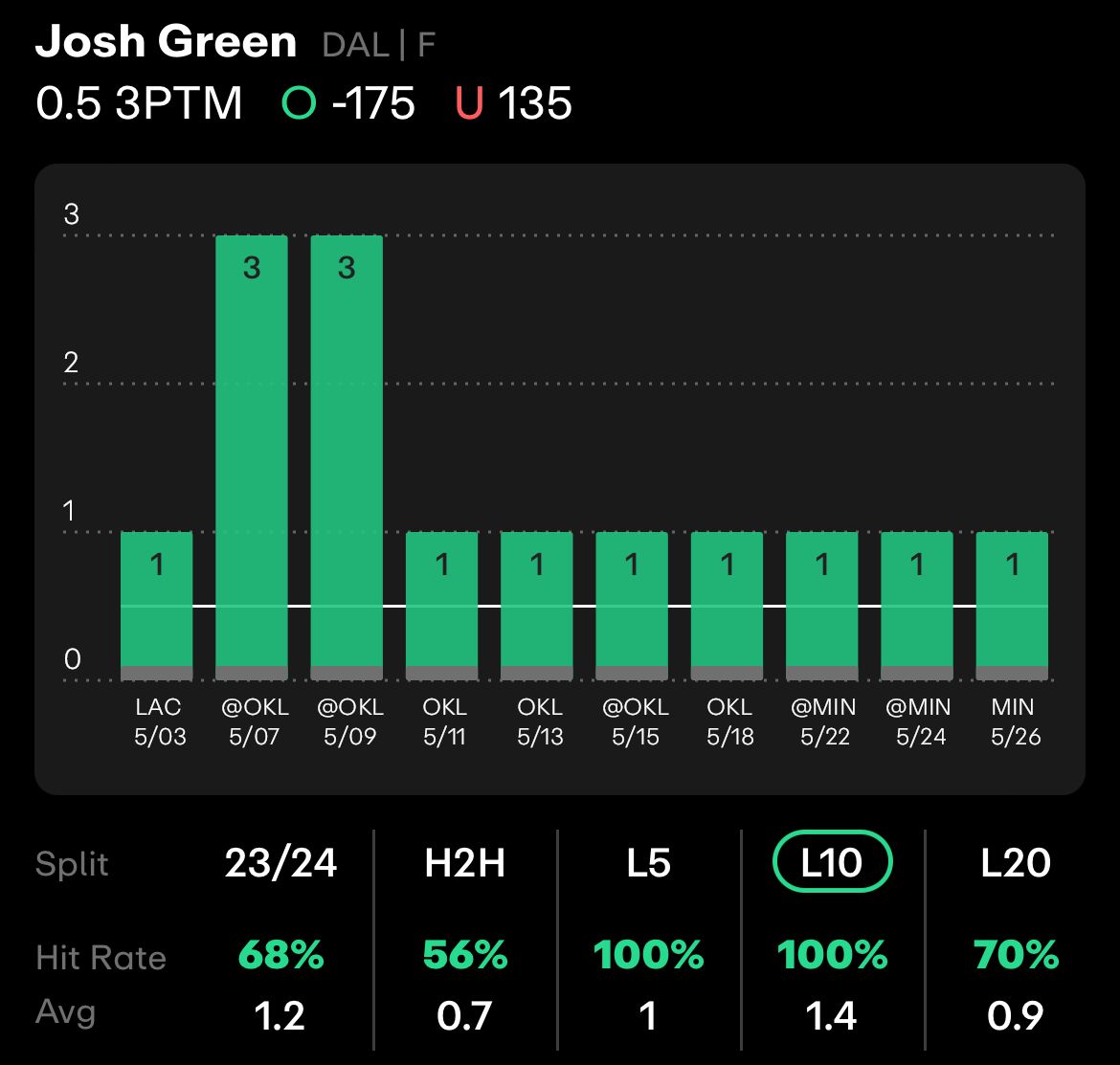 We’re riding the consistent hand here. Green has at least one three in 10 straight games. It’s as simple as that.
