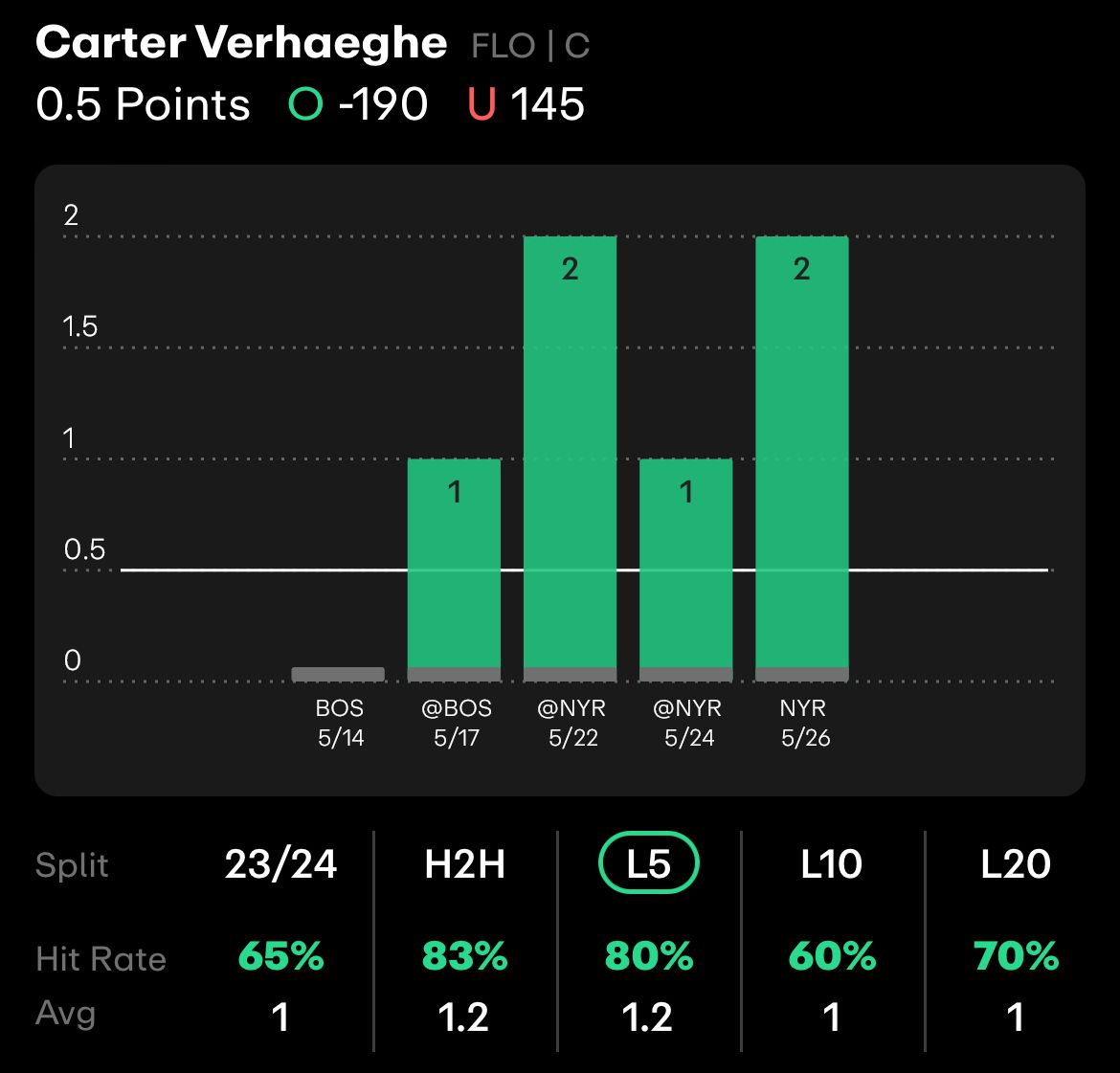 The Panthers are down 2-1 in the Eastern Conference Finals, but you can’t blame Carter Verhaeghe. Vergaeghe has at least a point in every game of this series, plus two multi-point games. We’re riding the hot hand here.