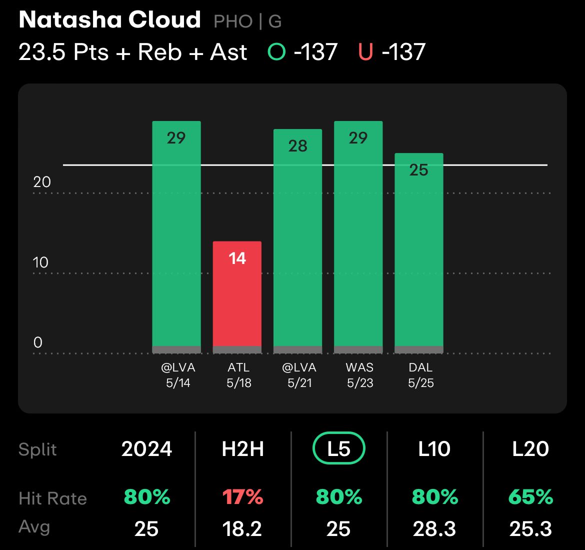 Cloud has gone over this line in 4 of her 5 games as a member of the Mercury, so we’re highlighting the hot hand here.