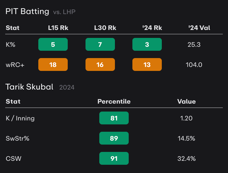 Skubal is among the highest percentiles for pitchers in strikeouts per inning, and he gets a juicy matchup against the Pirates who strike out the 3rd most amongst MLB teams versus left-handed pitchers.