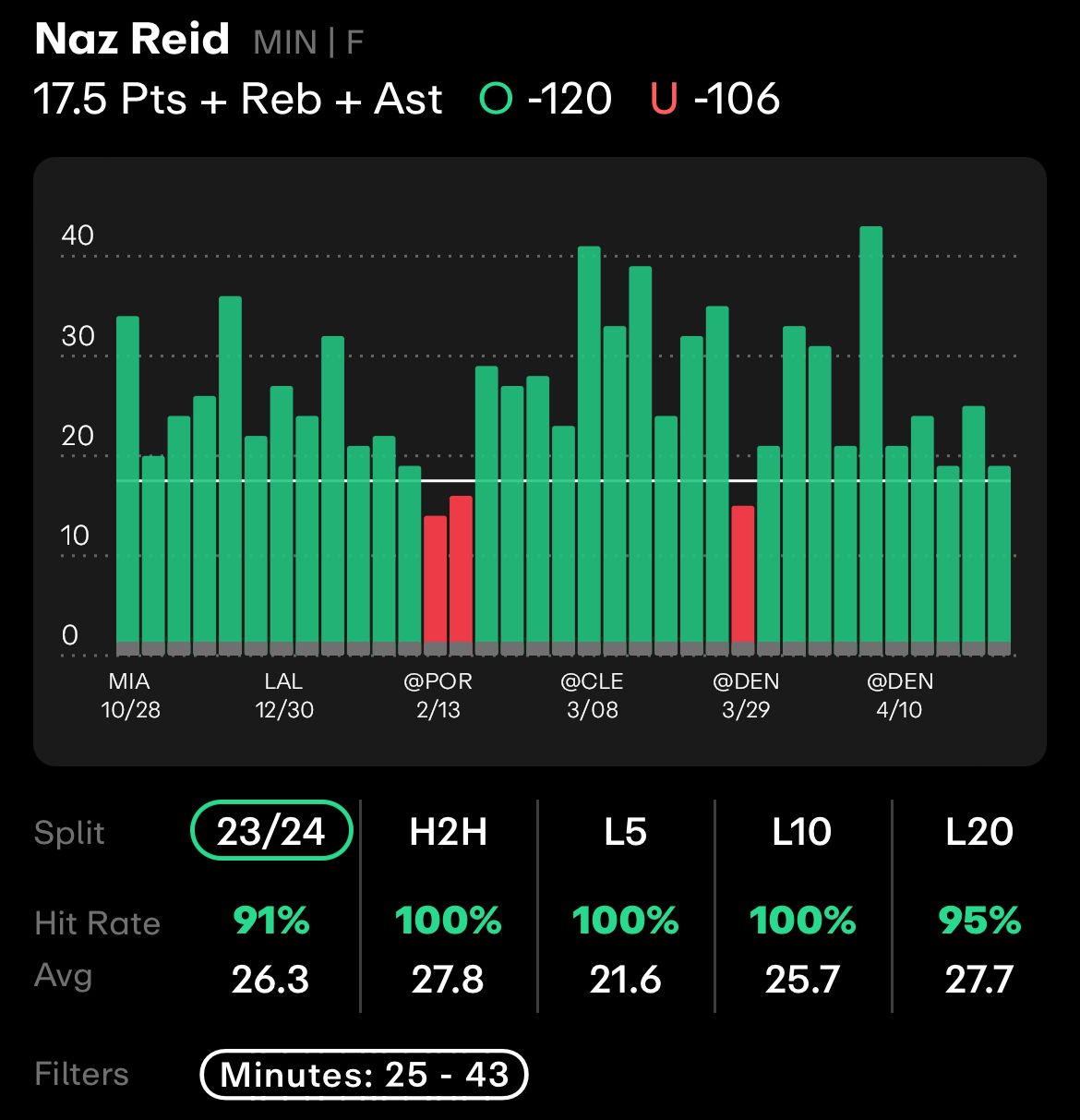 Naz Reid has given the Timberwolves solid minutes off the bench in these playoffs, going over this line in 4 of his last 5 games.