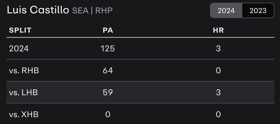 Luis Castillo doesn’t give up a lot of home runs, but when he does they’re usually to left-handed hitters. This year, Castillo has given up 3 bombs, all to lefties.