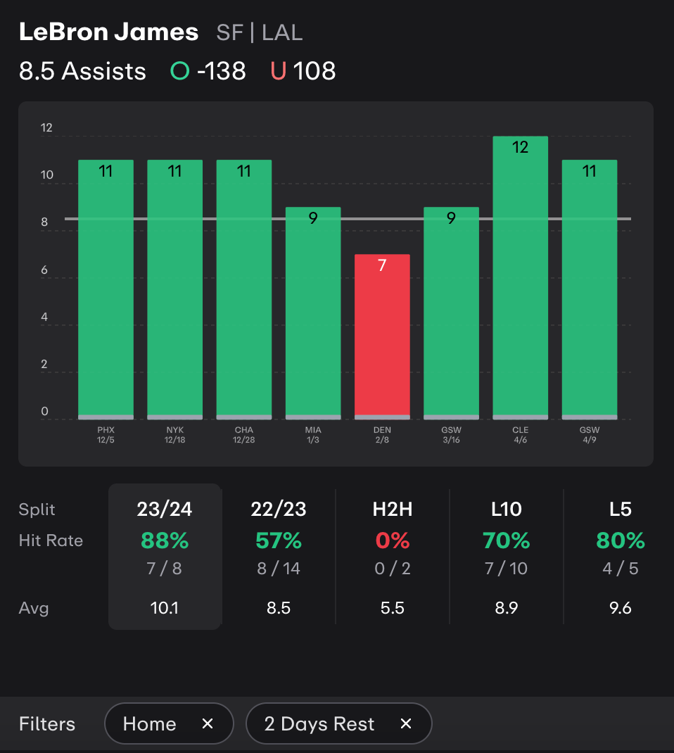 LeBron James back at home, in a must-win game? Just like Embiid, the narrative alone is juicy. And the data is there to back it up. James has been over this line in 88% of his home games with 2 days’ rest this season.